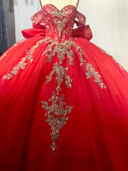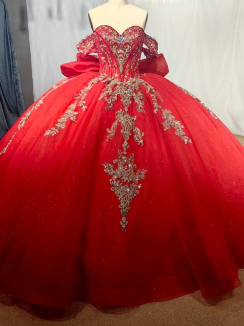 • Vibrant Red Quinceanera Dress Off Shoulder Ball Gown Sparkly Beaded Tulle Prom Gown Big Bow (Customer Link – change sleeves)