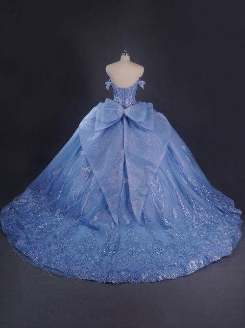 • Sparkling Light Blue Quinceanera Dress Off Shoulder Ball Gown Glitter Tulle Crystal Prom Gown Big Bow