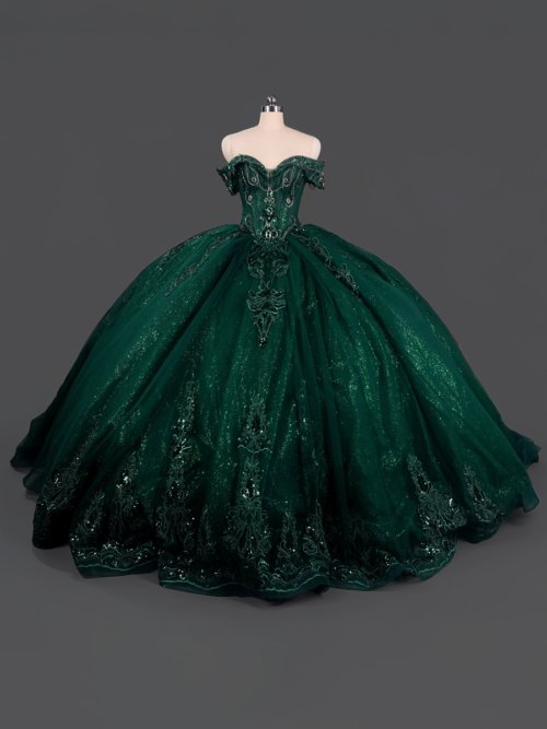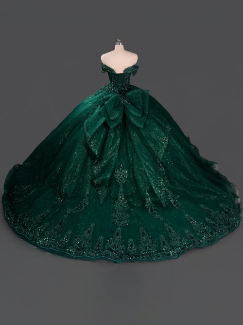 • Gorgeous Dark Green Quinceanera Dress Off Shoulder Ball Gown Sparkly Sequin Prom Gown Corset Bow