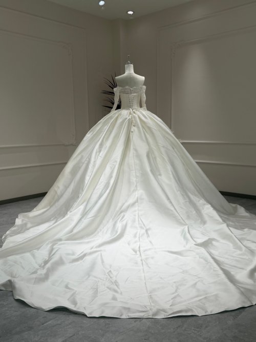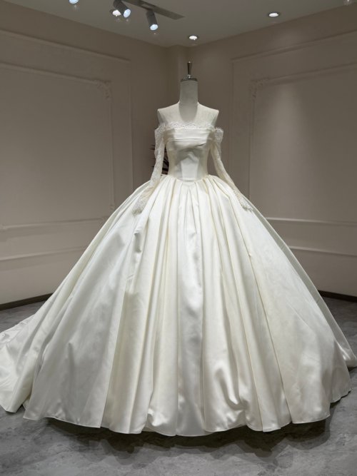 • Classic Ivory Satin Wedding Dress Off Shoulder Ball Gown Minimalist Long Sleeve Bridal Gown Lace Back