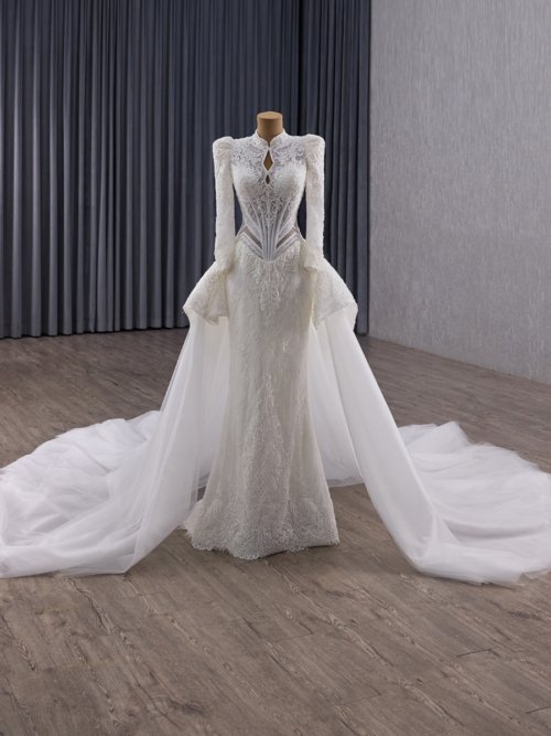 • Elegant Ivory High Neck Long Sleeve Lace Wedding Dress Detachable Train Trumpet Bridal Gown