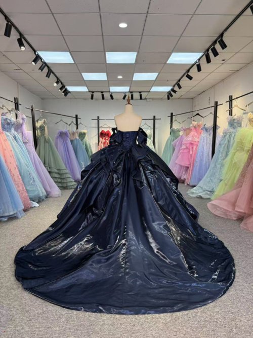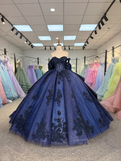 • Sparkling Navy Blue Quinceanera Dress Off Shoulder Ball Gown Sweetheart Bodice Quinceanera Gown With Dramatic Satin Train And Lace Appliques
