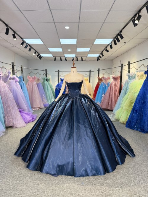 • Elegant Midnight Blue Quinceanera Dress Beaded Long Sleeves Ball Gown Corset Back Quinceanera Gown With Satin Bodice And Dramatic Train