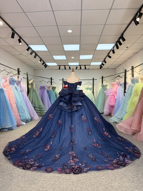 • Stunning Deep Blue Quinceanera Dress Floral Applique Off Shoulder Corset Back Quinceanera Gown With Glitter Tulle And Ruffled Train
