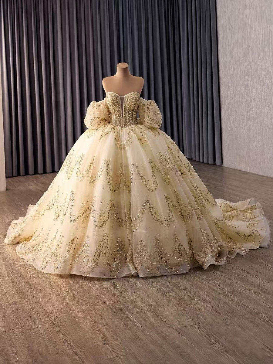 Luxurious Gold Beaded Quinceanera Dress with Sweetheart Neckline Ball Gown Style