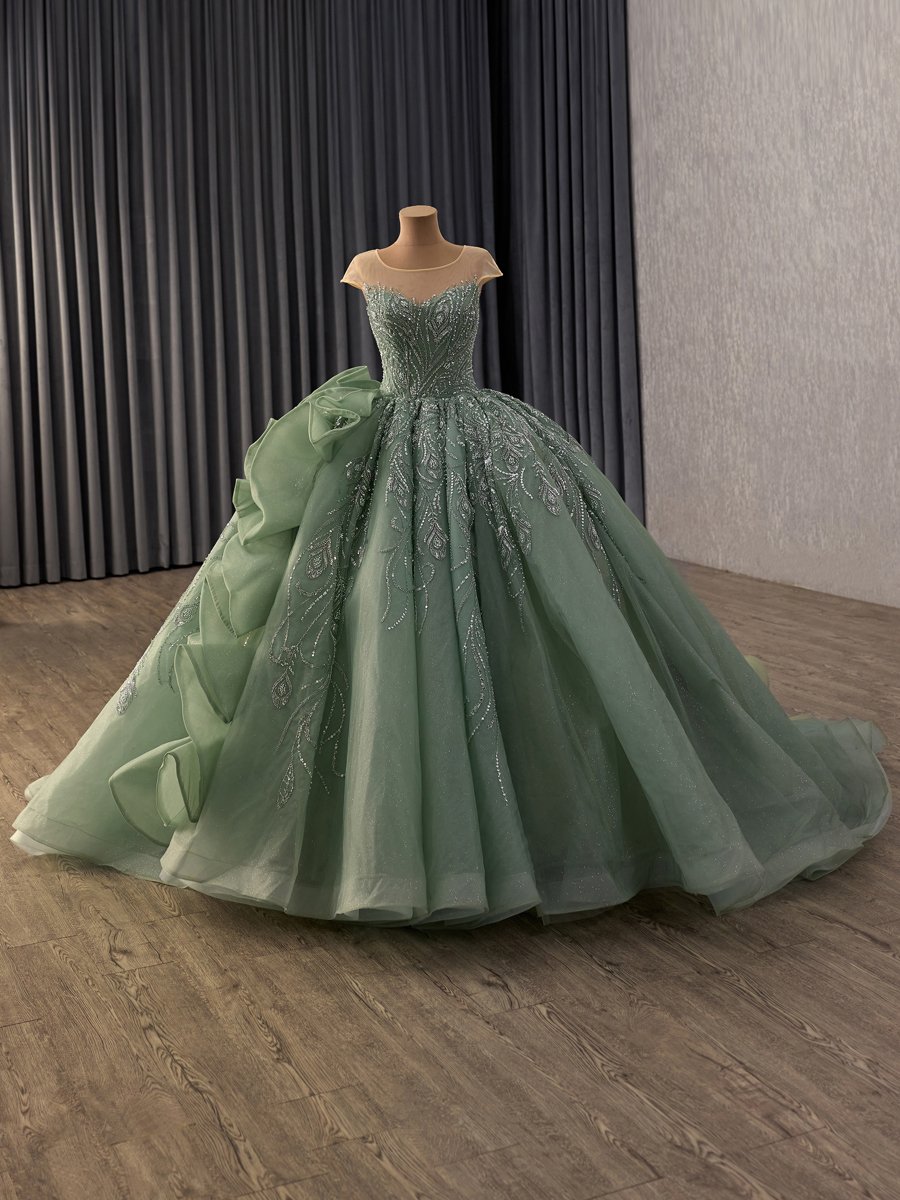Luxury Sage Green Quinceanera Dress Ball Gown Off Shoulder Corset Back Beaded Design Quinceanera Dress Sweep Train