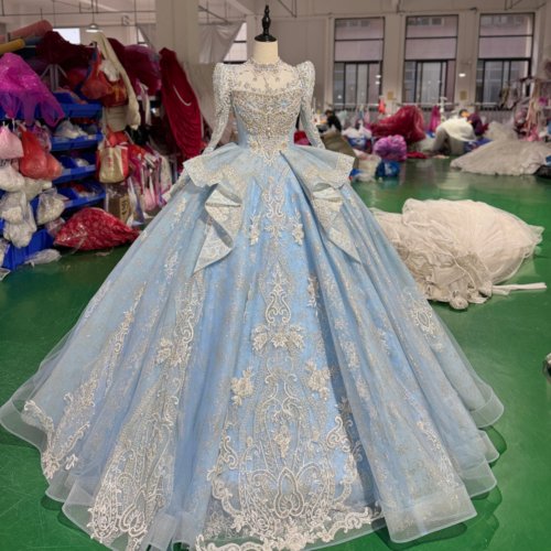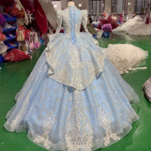 • Princess Light Blue Long Sleeve Ball Gown Quinceanera Dress High Neck Dress Sweet 16 Dress