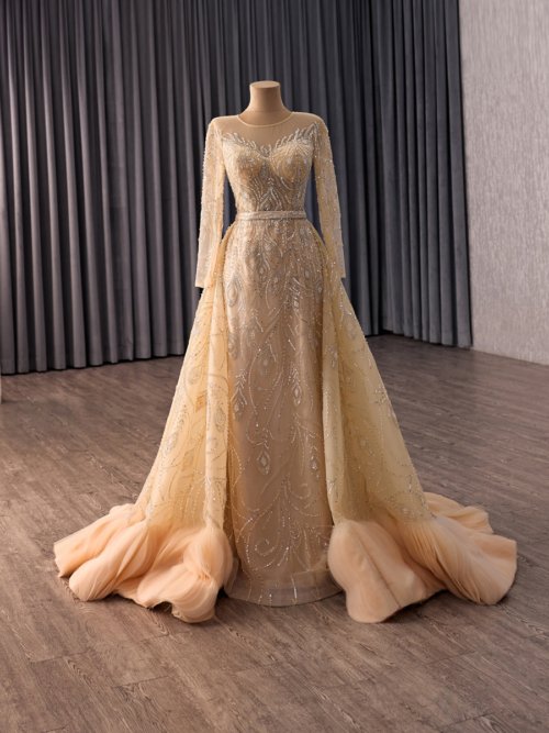 • Elegant Champagne Evening Dress Long Sleeves Beaded Sequins Mermaid Gown Formal Party Dress