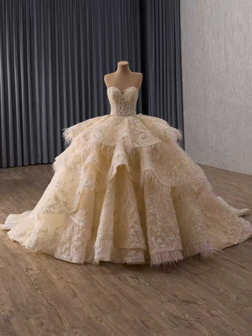 • Luxury Champagne Ball Gown Sequin Feathered Tiered Ruffles Quinceanera Dress Corset Back Sweet 16 Dress