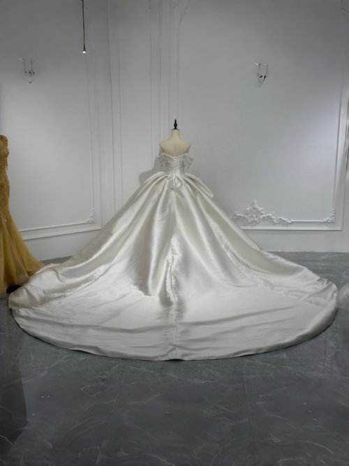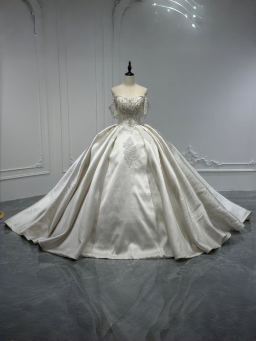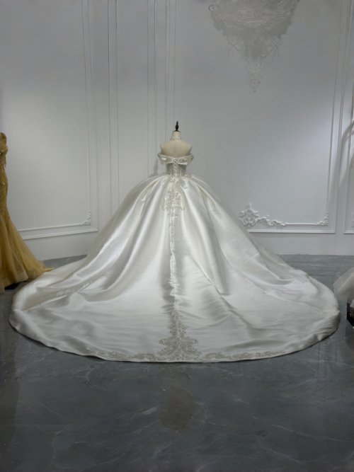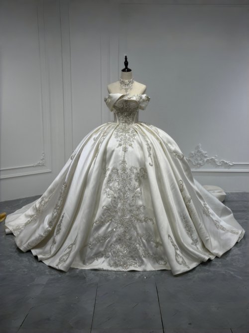 • Exquisite Ivory Wedding Dress Off Shoulder Ball Gown Beaded Sequin Satin Bridal Gown With Train