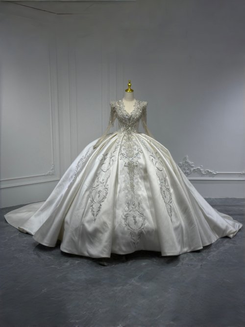 • Magnificent Ivory Wedding Dress Long Sleeve V Neck Ball Gown Crystal Beaded Satin Bridal Gown