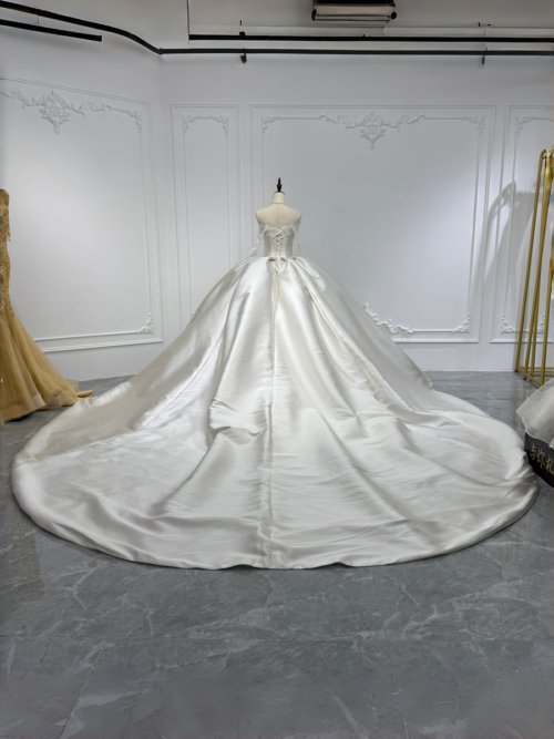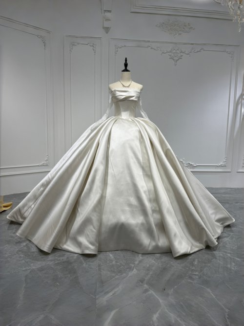 • Classic Ivory Satin Wedding Dress Off Shoulder Ball Gown Minimalist Long Sleeve Bridal Gown Lace Back