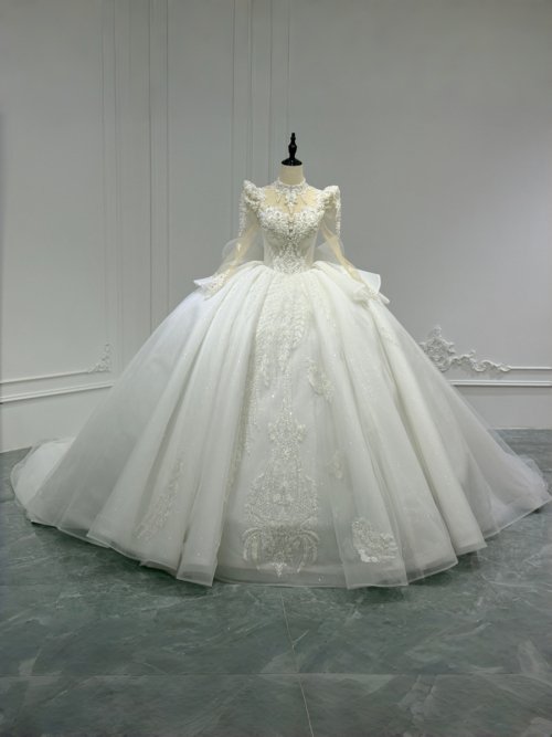 • Magnificent Ivory Silver Wedding Dress High Neck Ball Gown Glitter Beaded Long Sleeve Bridal Gown Royal