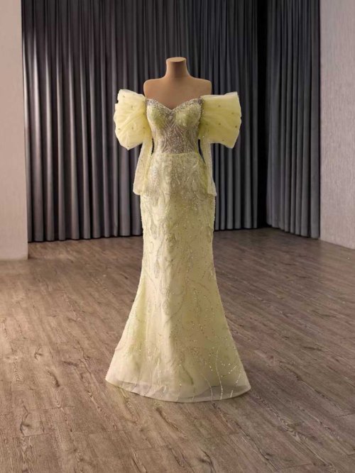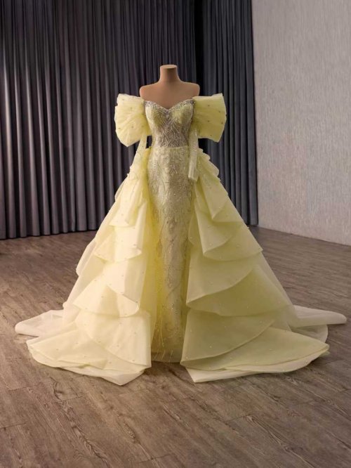 • Elegant Yellow Mermaid Off Shoulder Beaded Detachable Train Evening Dress Corset Back Prom Gown