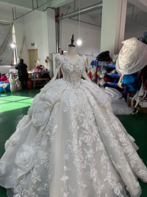 • Luxury Ivory Wedding Dress Ball Gown Long Sleeves High Neck 3D Flowers Bridal Gowns Lace Up Back