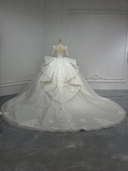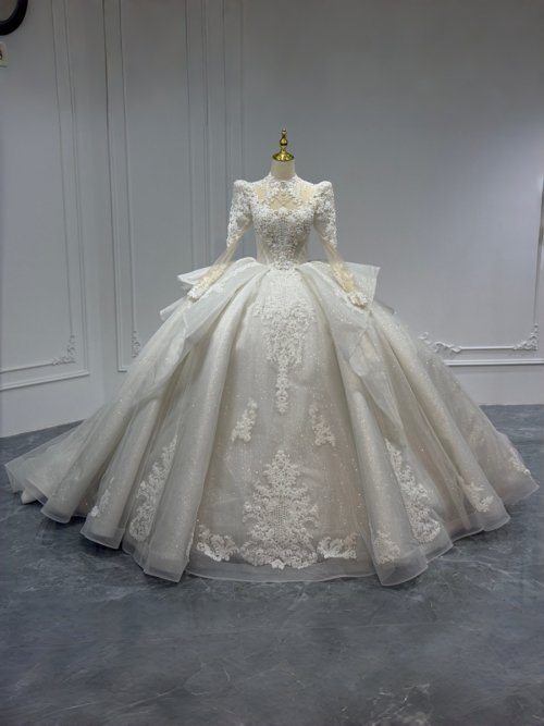 • Majestic Sparkly Ivory Wedding Dress Long Sleeve High Neck Beaded Cathedral Bridal Gown