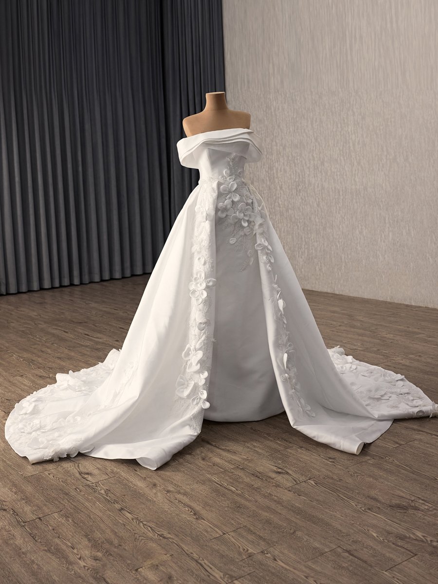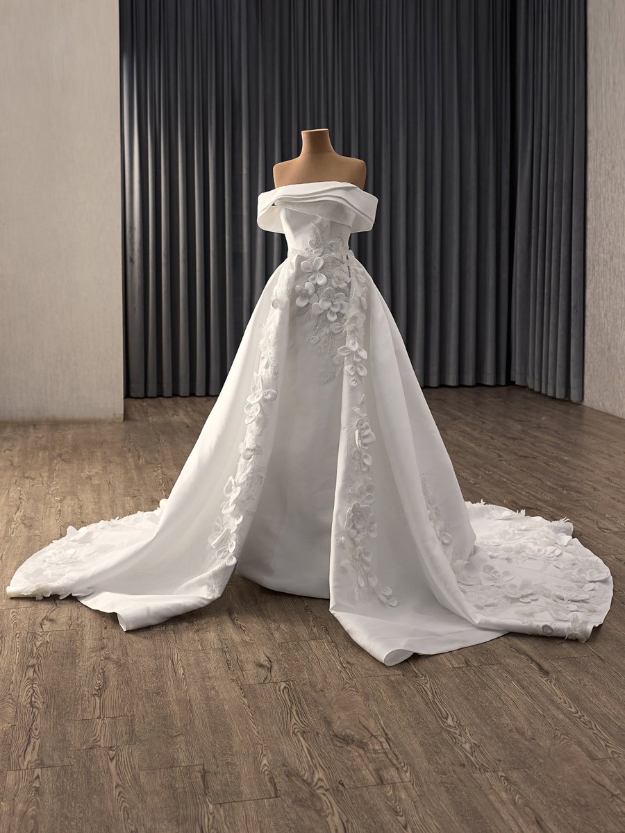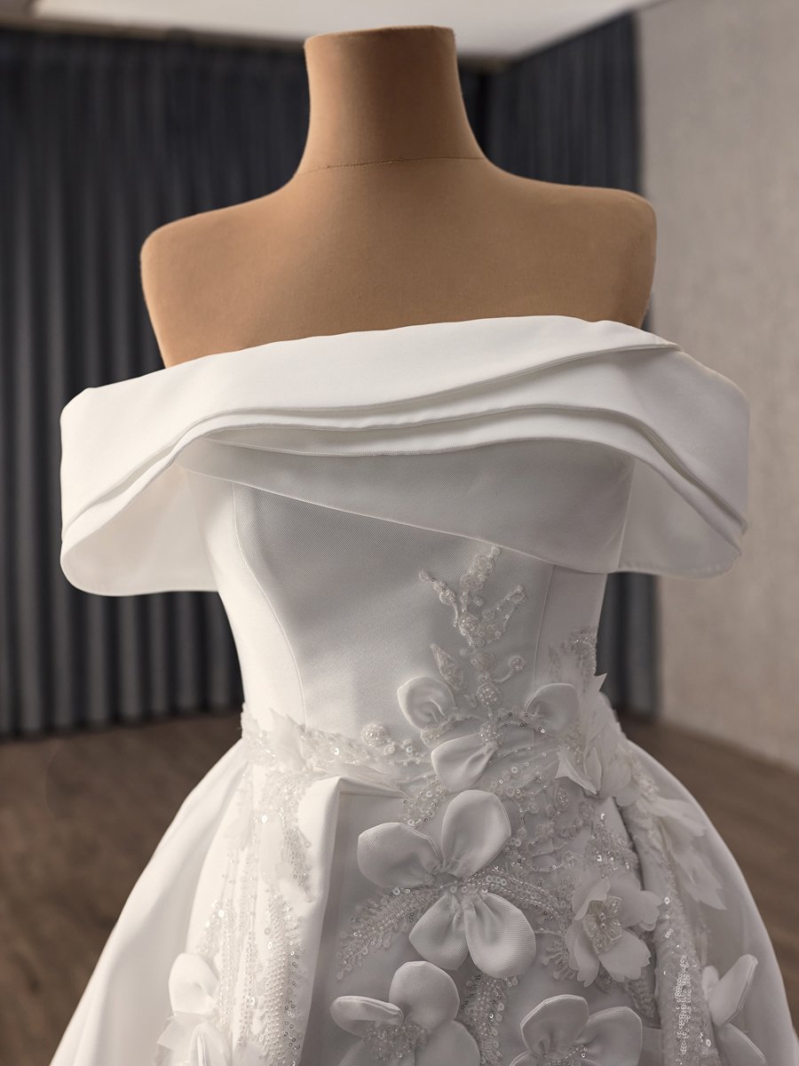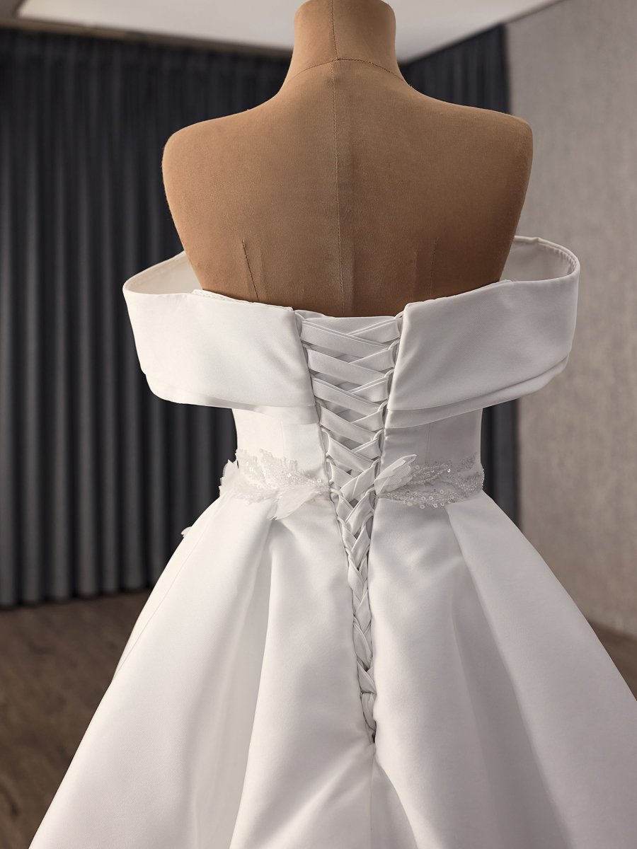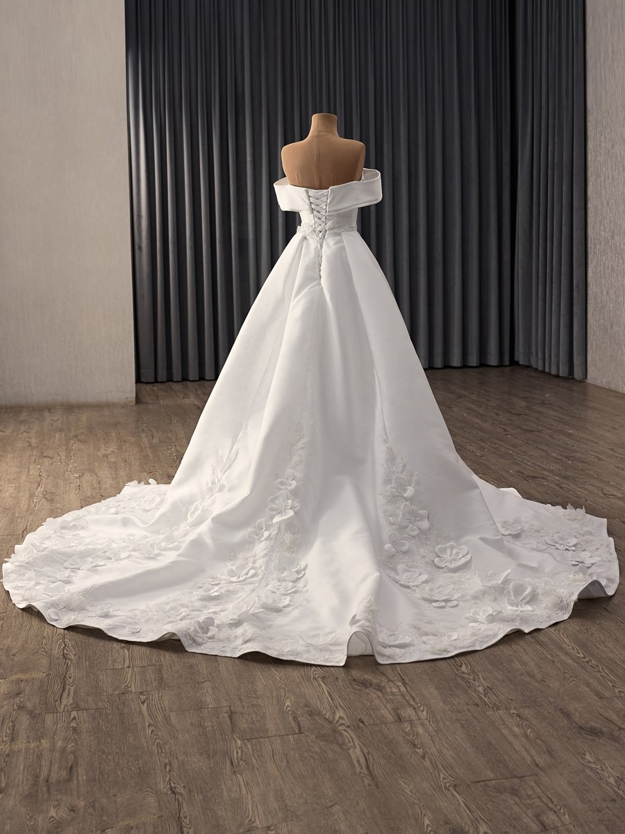 Chic Ivory Floral Applique Off Shoulder Wedding Dress Corset Back Ball Gown Chapel Train Gown