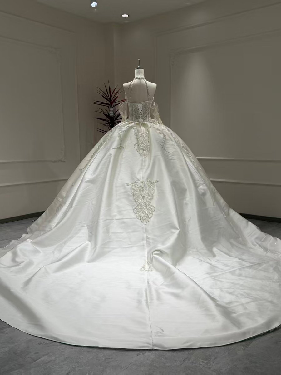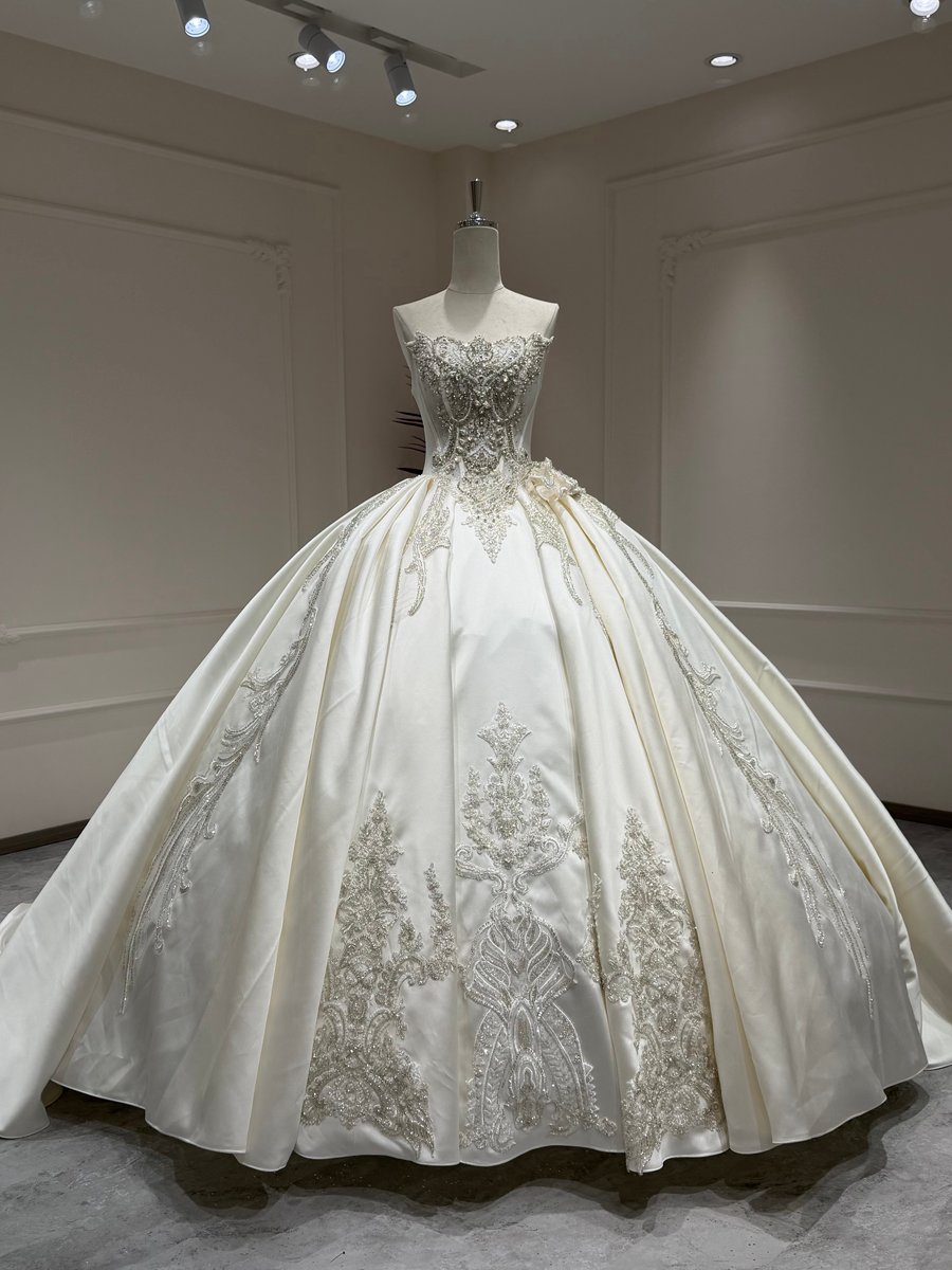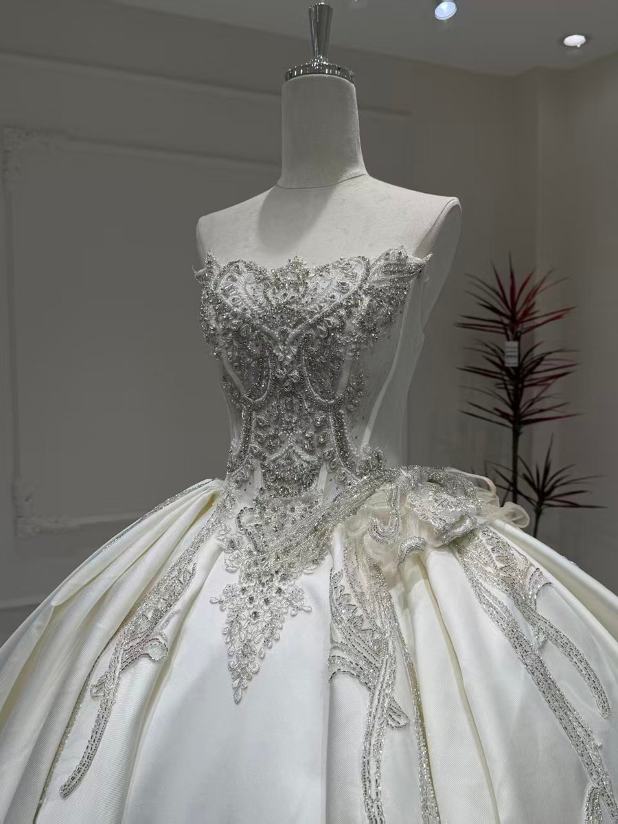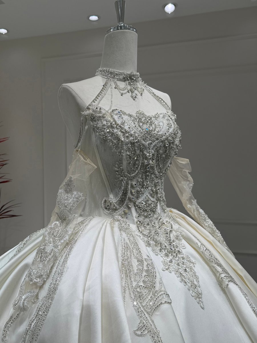 Elegant Ivory Satin Wedding Dress Ball Gown Beaded Luxurious Long Sleeve Bridal Gown Off Shoulder Corset