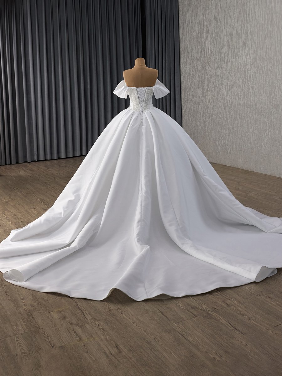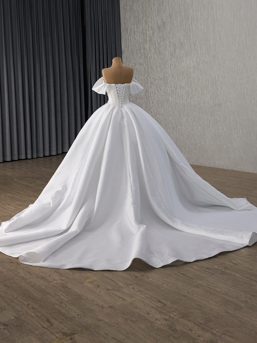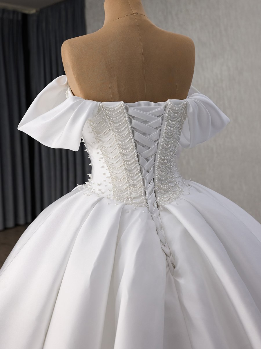 Elegant Ivory Satin Wedding Dress Off Shoulder Ball Gown Sweetheart Beaded Bridal Gown Lace Up Corset