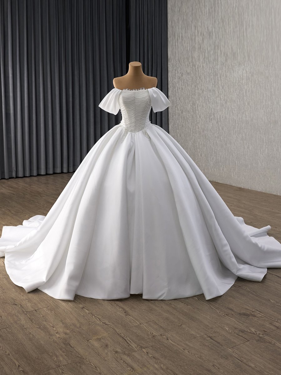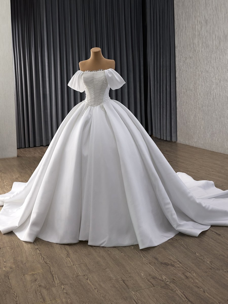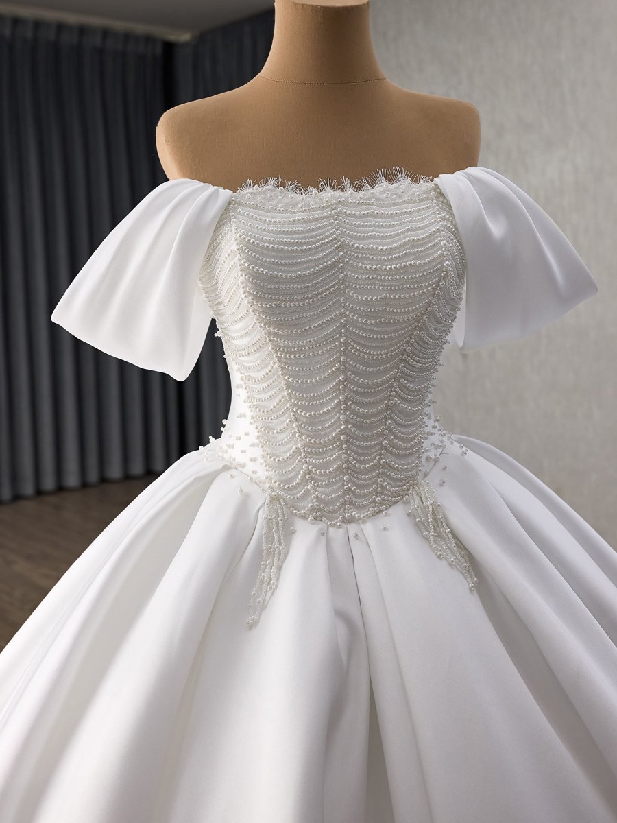 Elegant Ivory Satin Wedding Dress Off Shoulder Ball Gown Sweetheart Beaded Bridal Gown Lace Up Corset