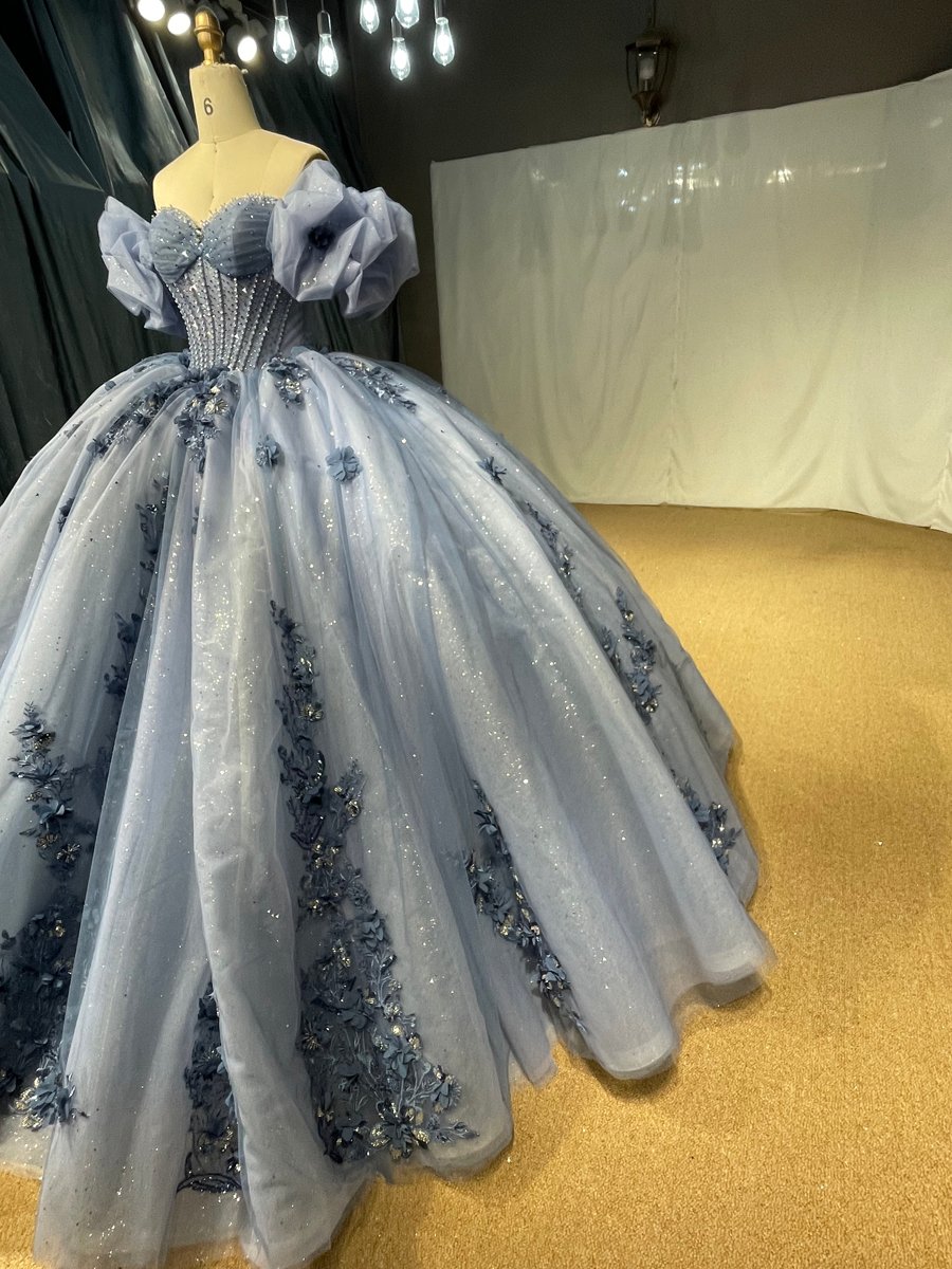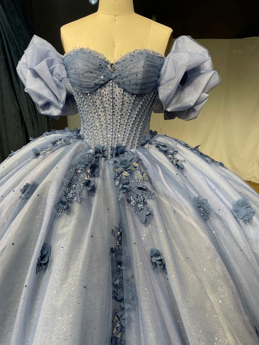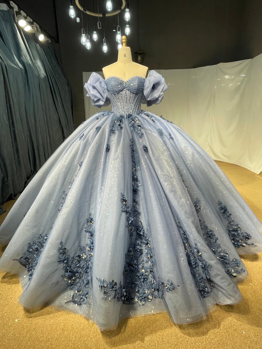 Elegant Sparkly Light Blue Ball Gown Prom Dress Off Shoulder Floral Lace Up Sweetheart Quinceanera Gown