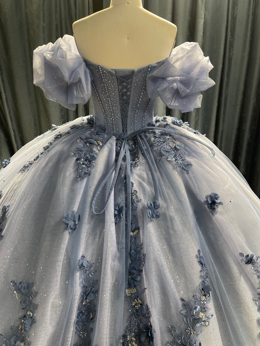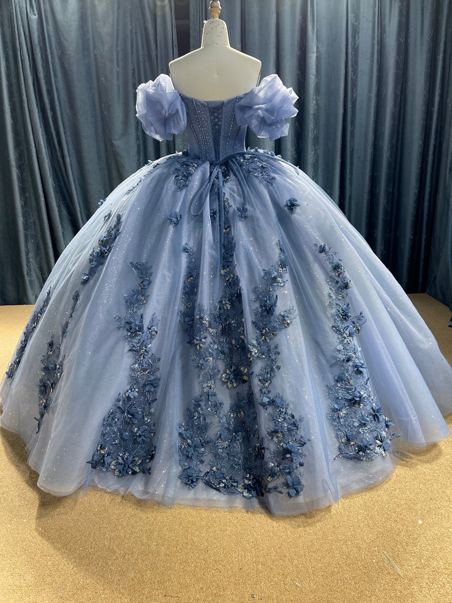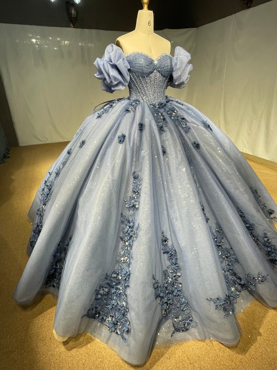 Elegant Sparkly Light Blue Ball Gown Prom Dress Off Shoulder Floral Lace Up Sweetheart Quinceanera Gown