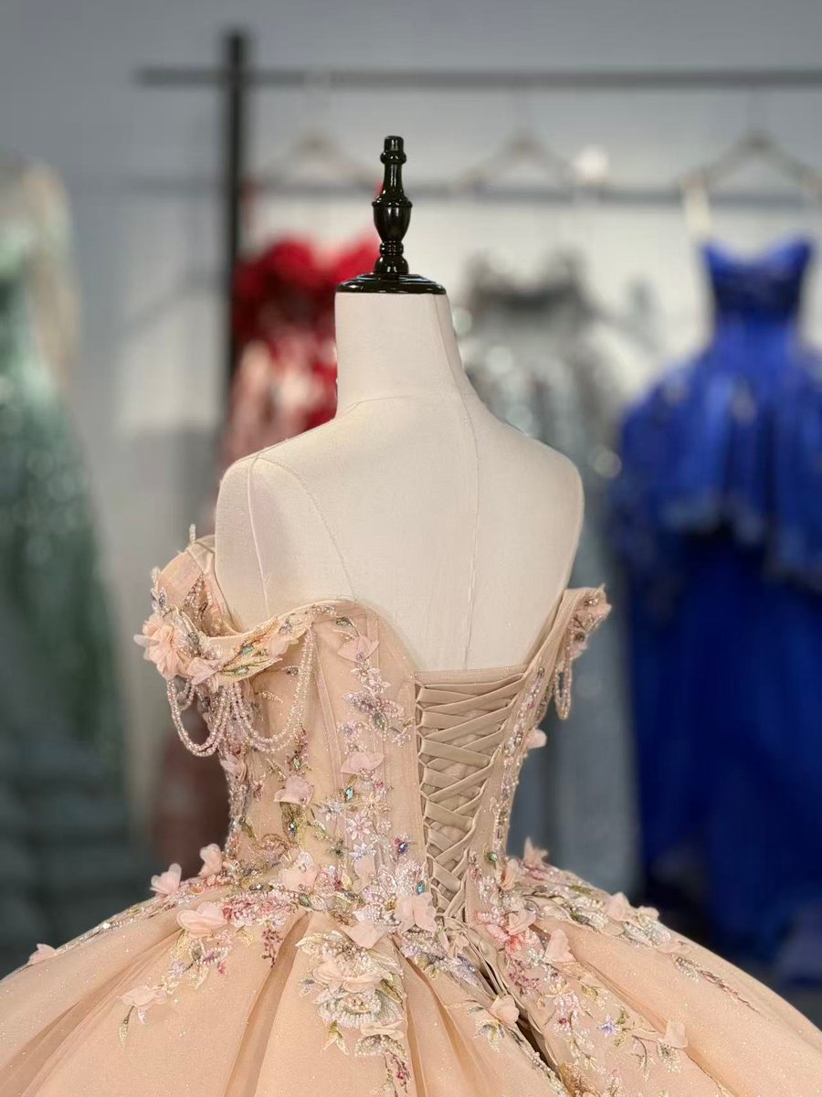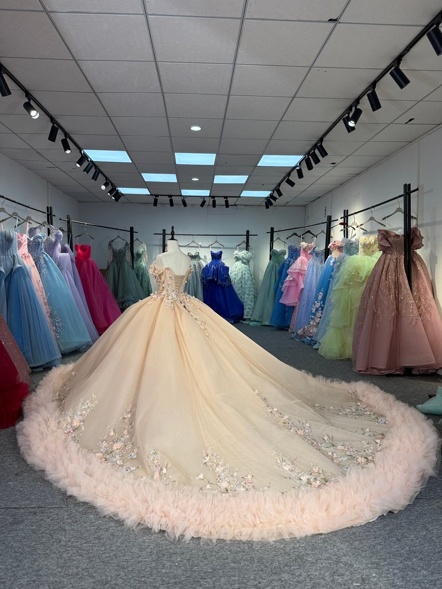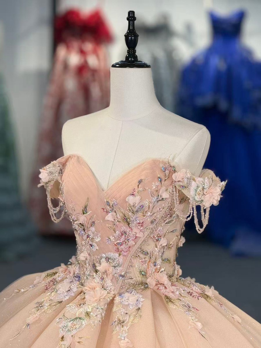 Enchanting Nude Floral Beaded Ruffles Off Shoulder Quinceanera Dress Train Sweetheart Corset Ball Gown