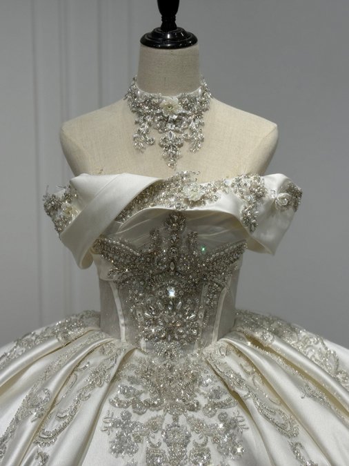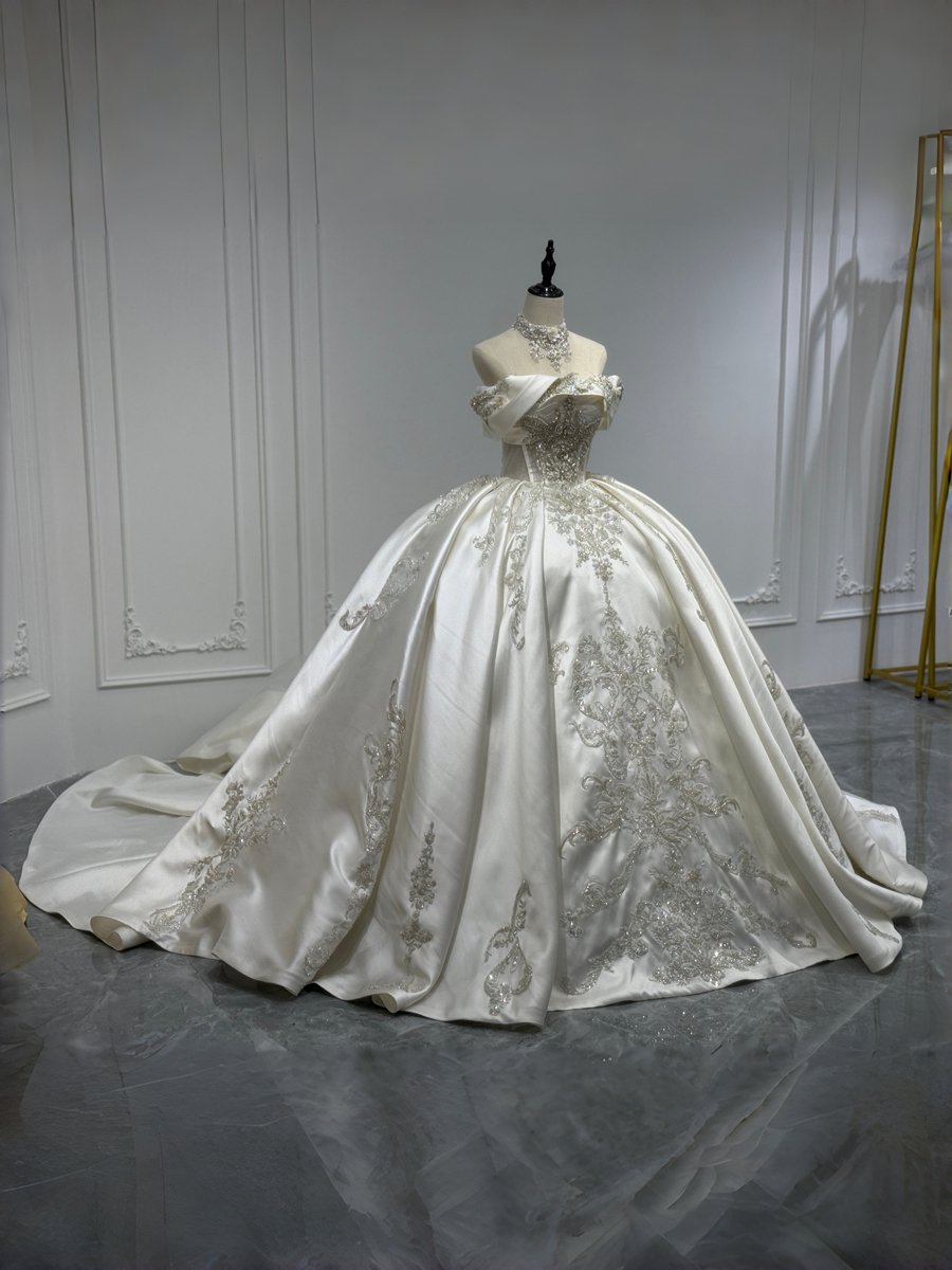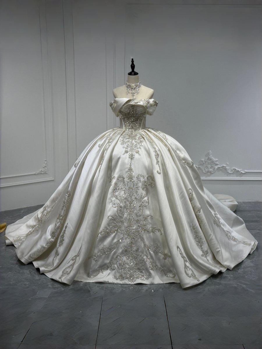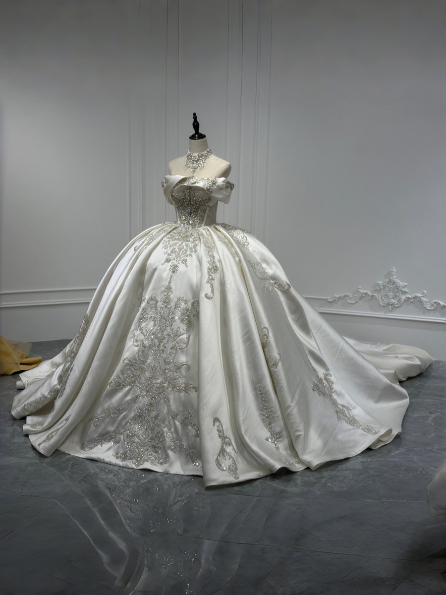 Exquisite Ivory Wedding Dress Off Shoulder Ball Gown Beaded Sequin Satin Bridal Gown With Train