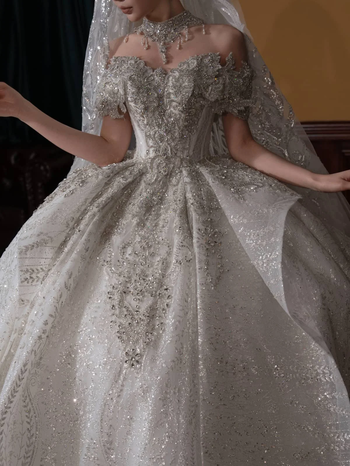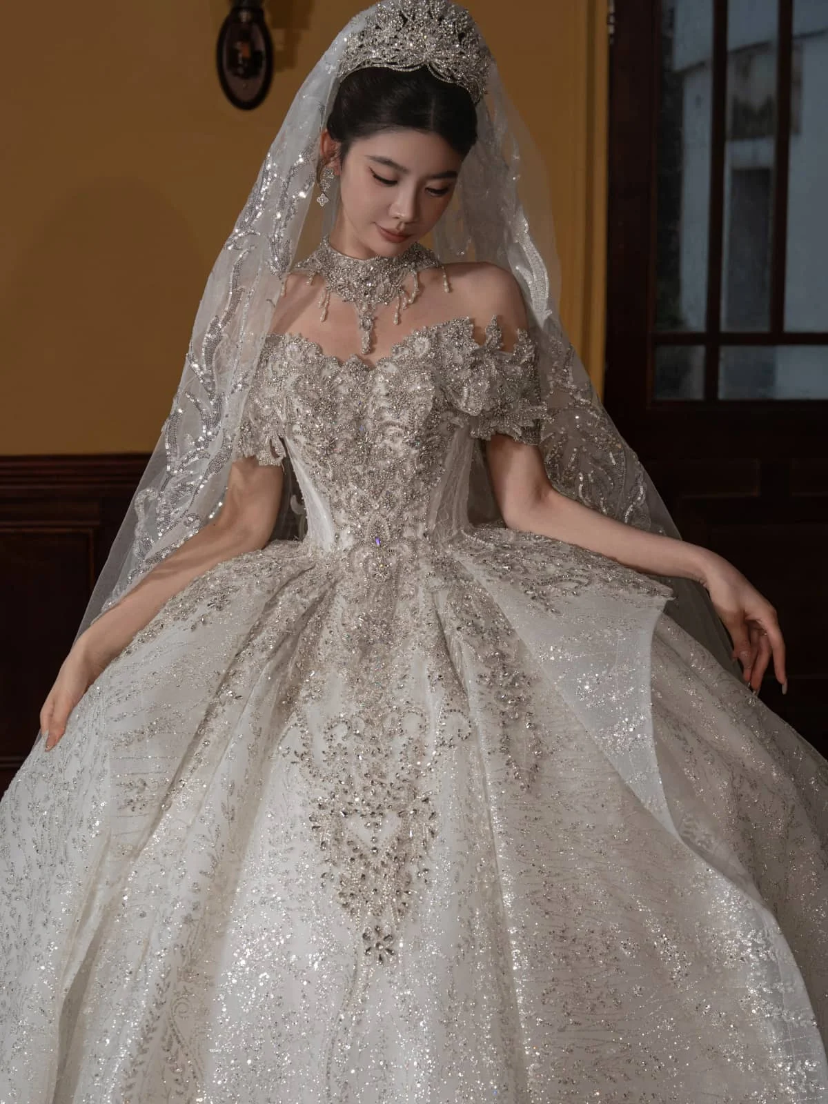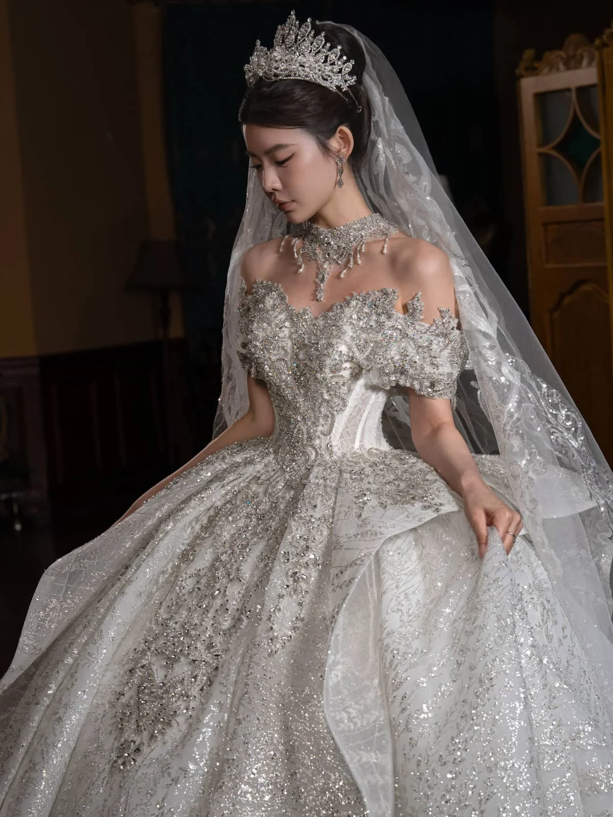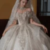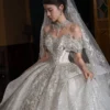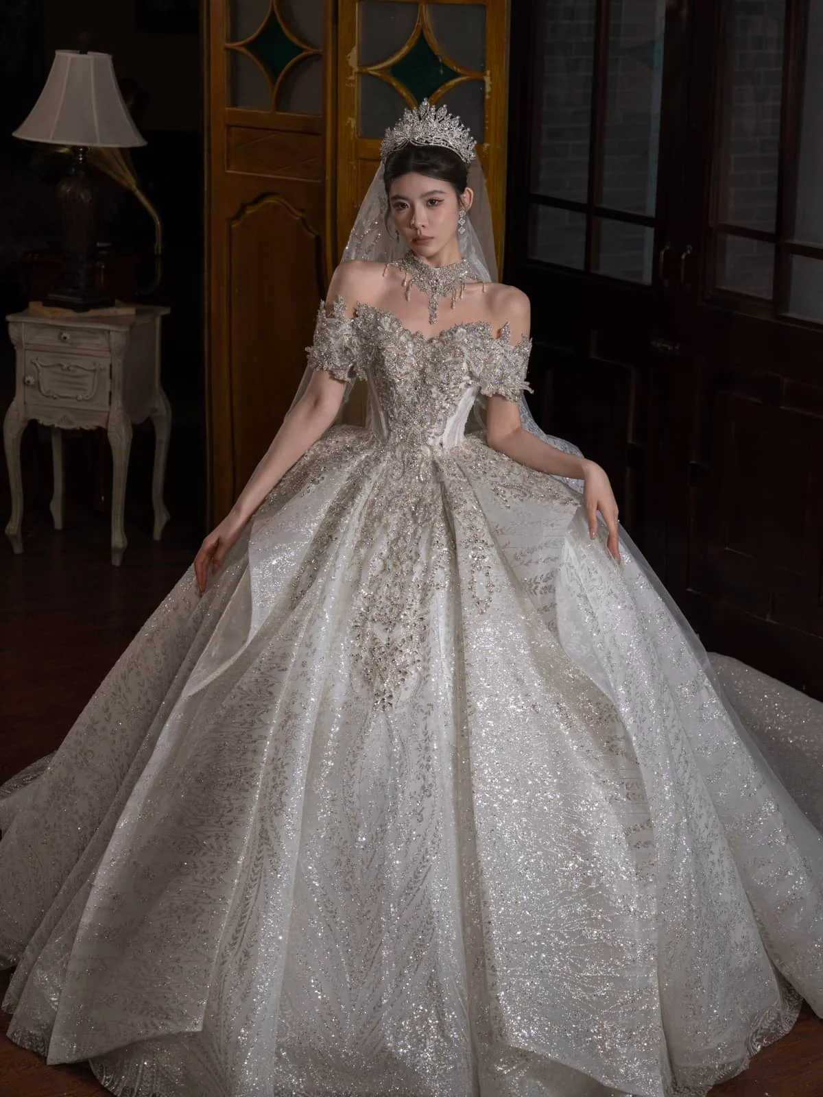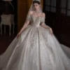 Glamorous Ivory Wedding Dress Ball Gown Off Shoulder Glitter Wedding Dress Sparkling Tulle Romantic Bridal Gown