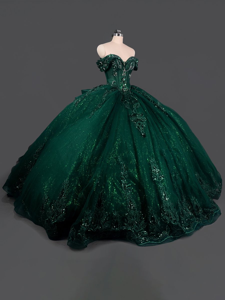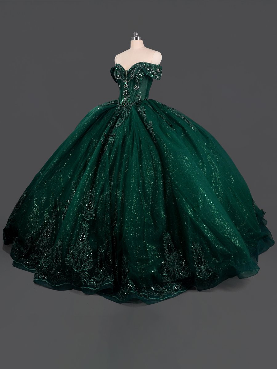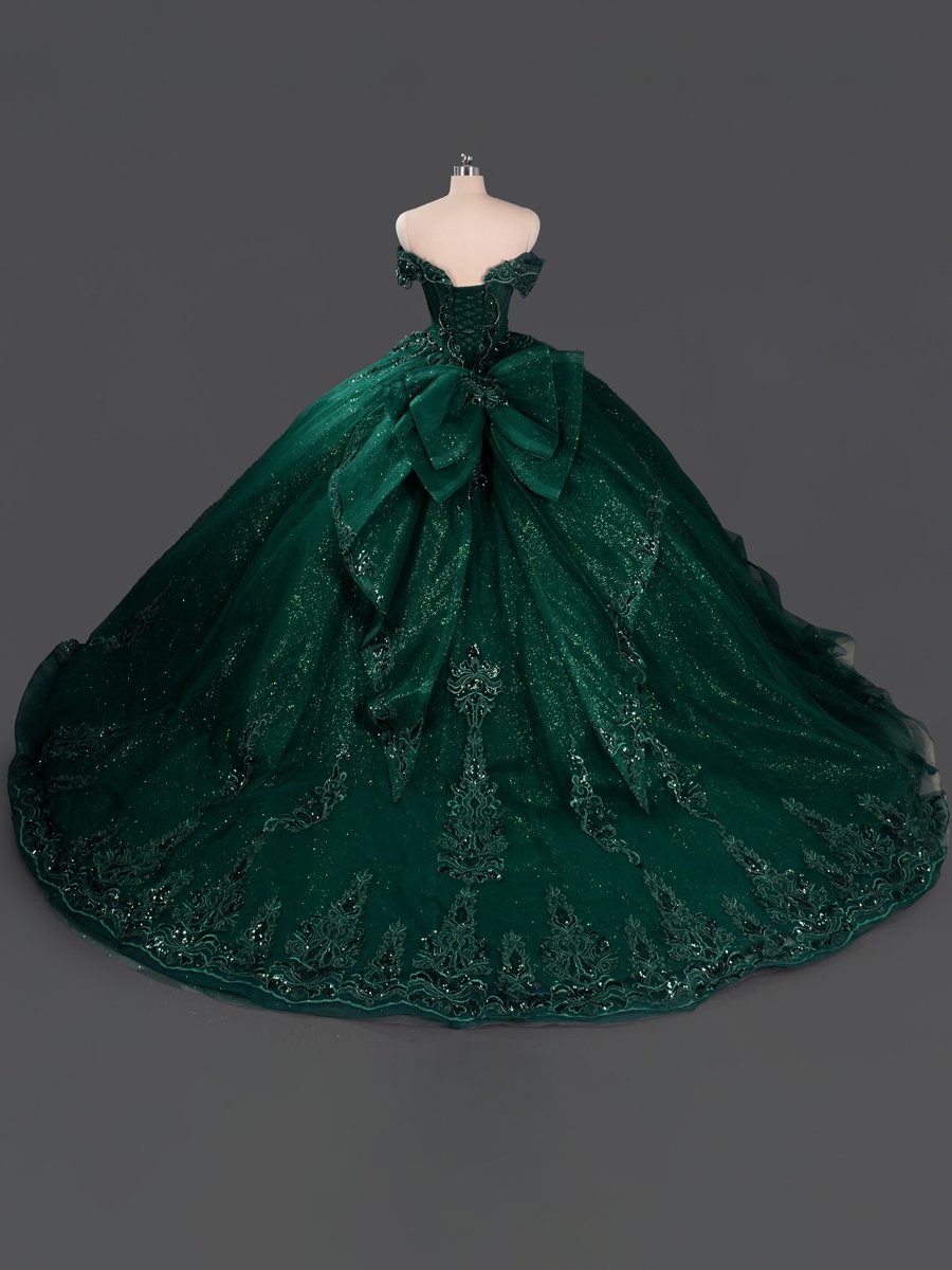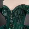 Gorgeous Dark Green Quinceanera Dress Off Shoulder Ball Gown Sparkly Sequin Prom Gown Corset Bow