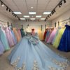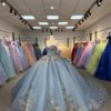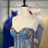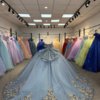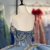 Luxurious Dusty Blue Quinceanera Dress Gold Appliques Ball Gown Sweetheart Corset Back Quinceanera Gown With Sparkle Tulle And Long Train