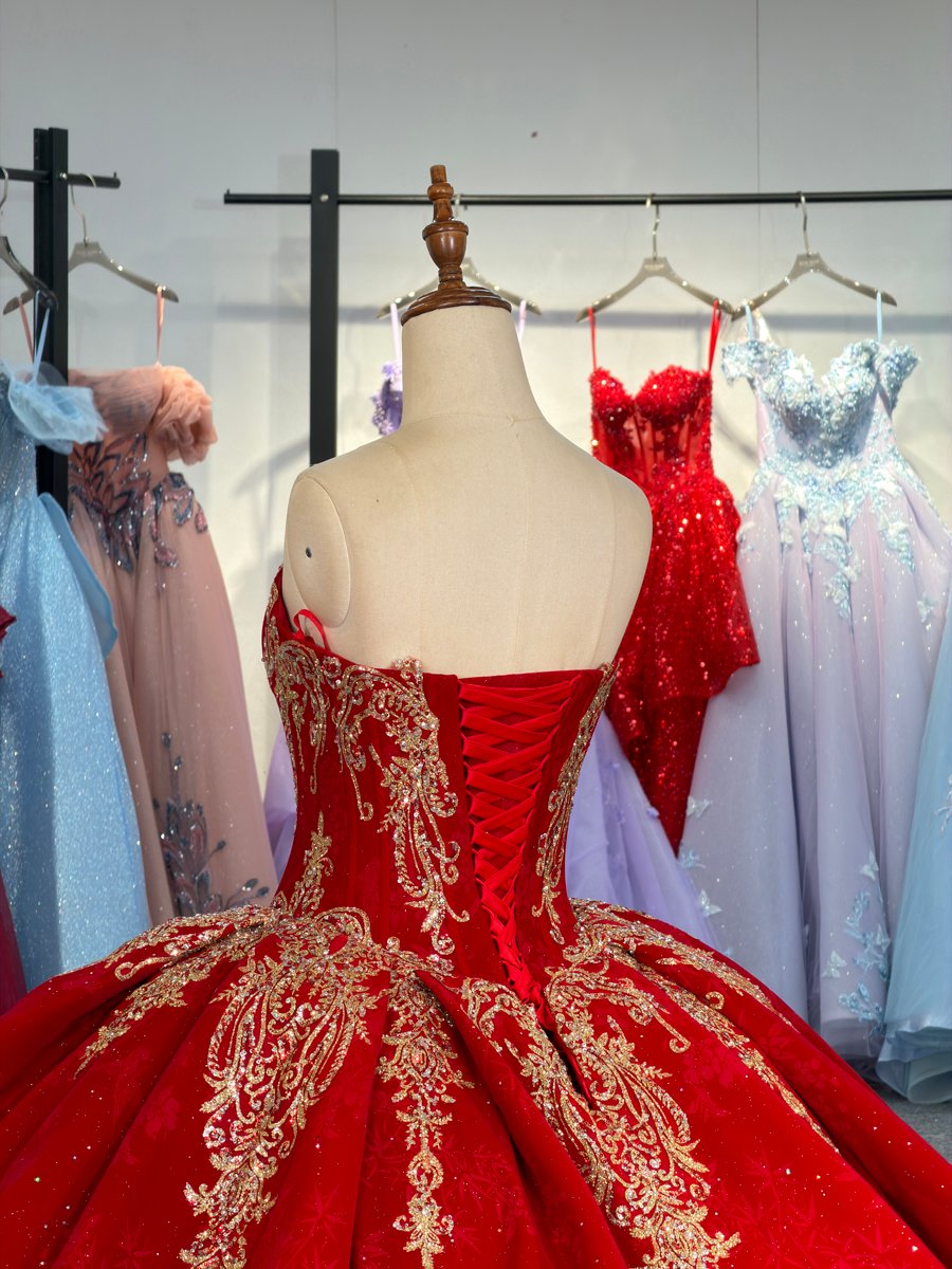 Luxurious Red Gold Embroidered Sweetheart Quinceanera Dress Backless Corset Ball Gown Long Train Cinderella Gown