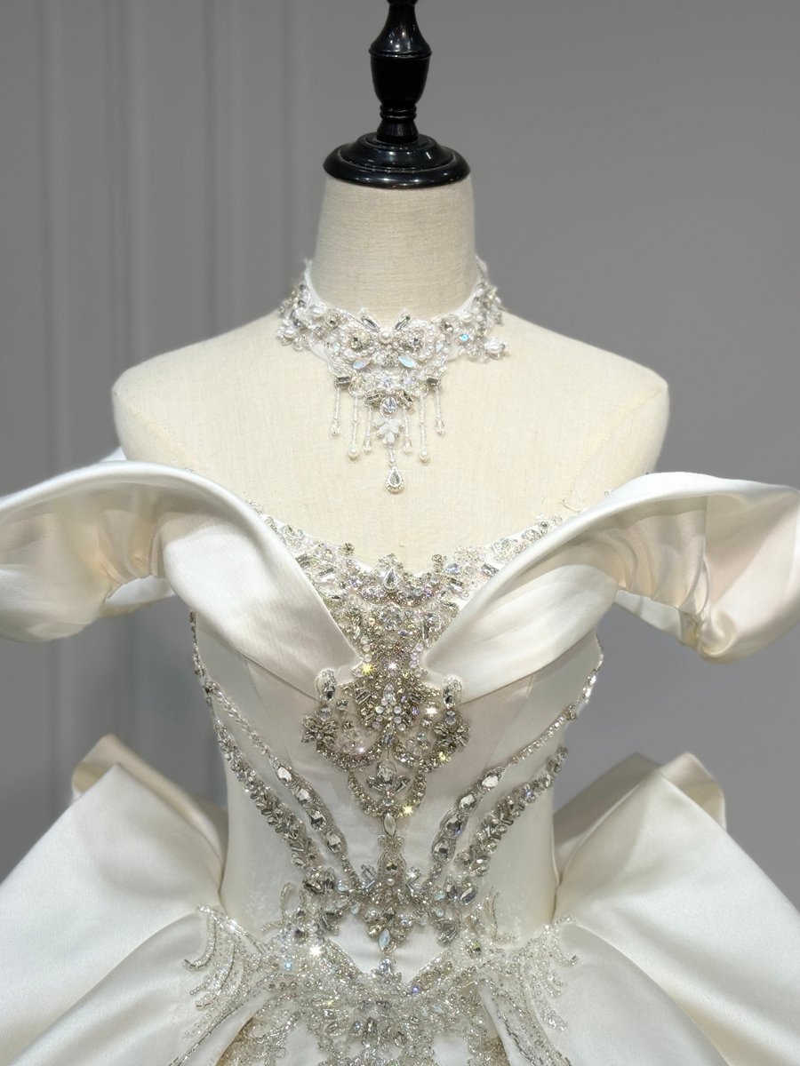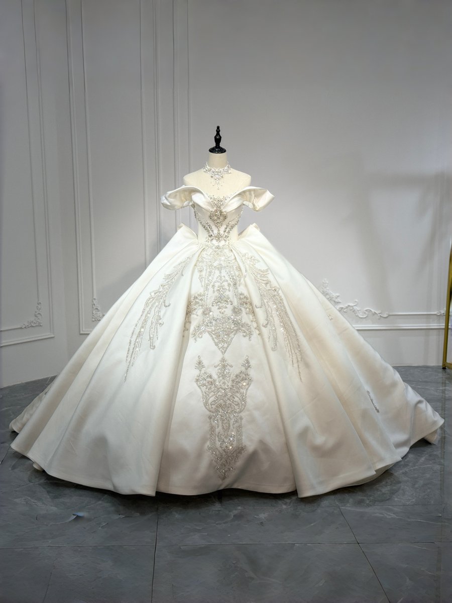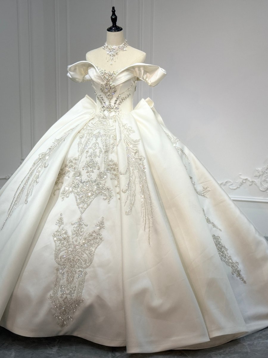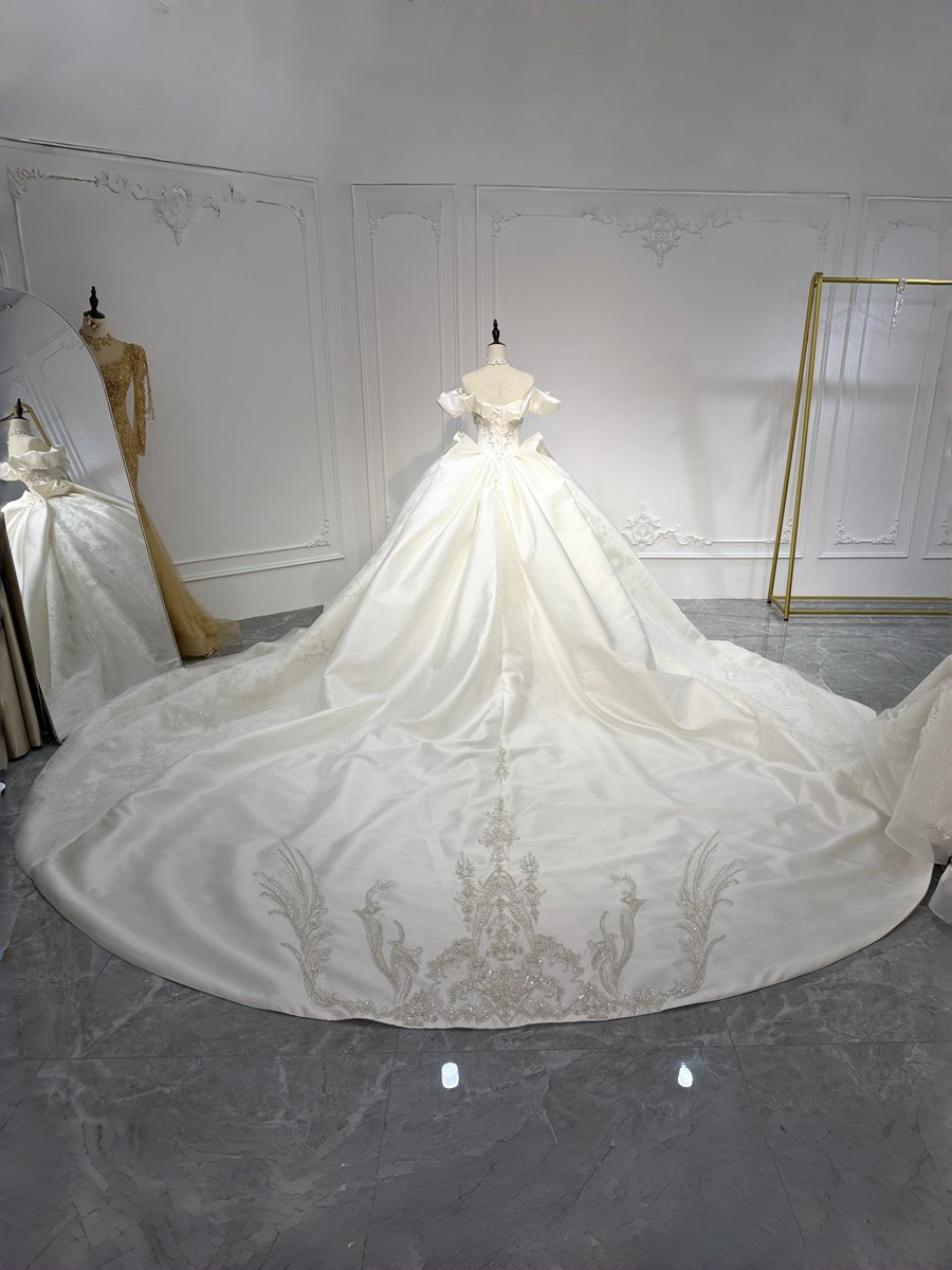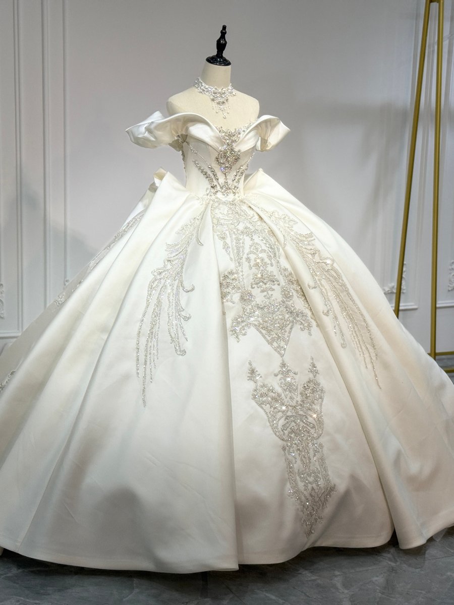 Luxury Ivory Wedding Dress Off Shoulder Beaded Satin Wedding Gown Cathedral Train Elegant Bridal Ball Gown