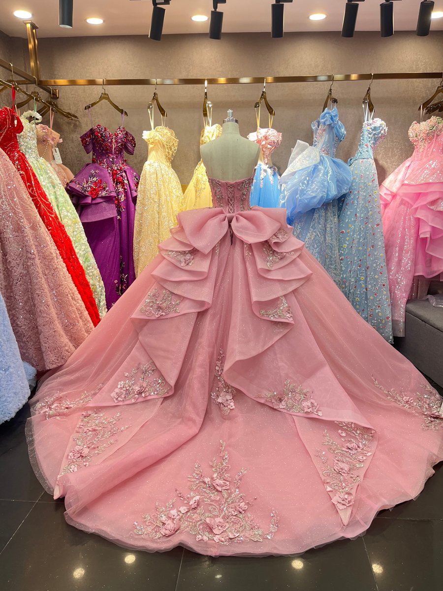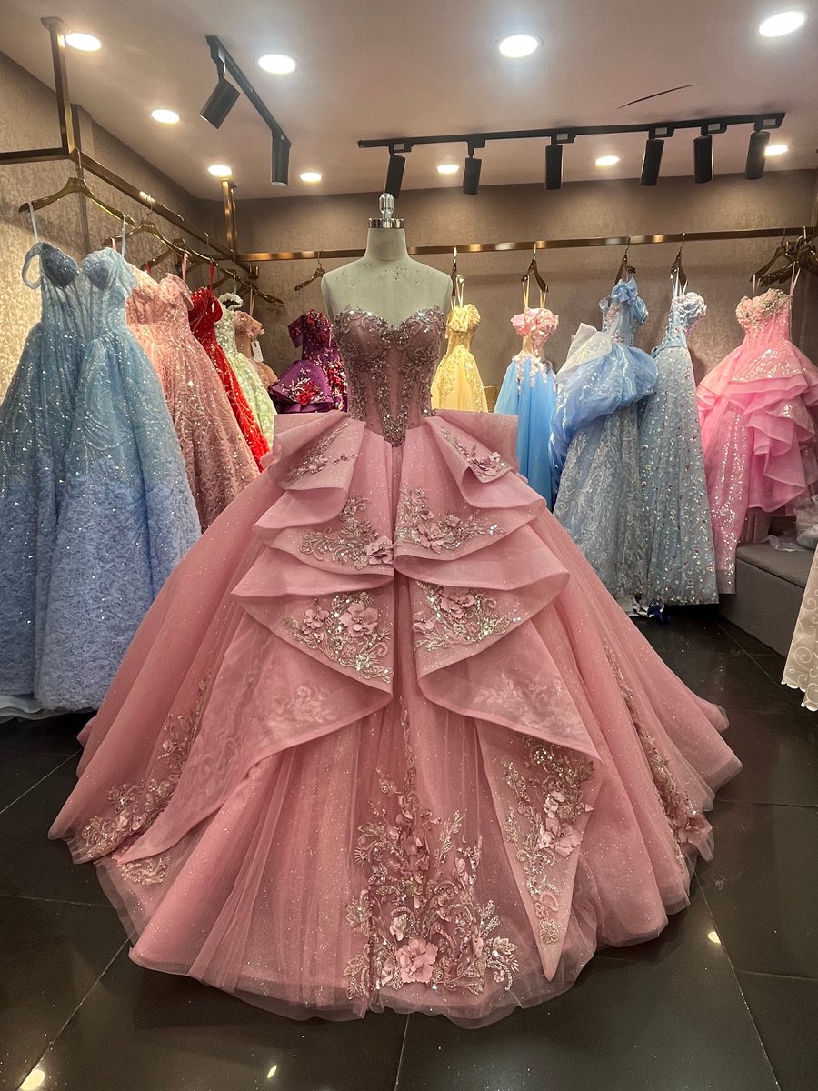 Luxury Pink Quinceanera Dress 3D Floral Beaded Ruffles Ball Gown Lace Up Sweet 16 Prom Party Wear
