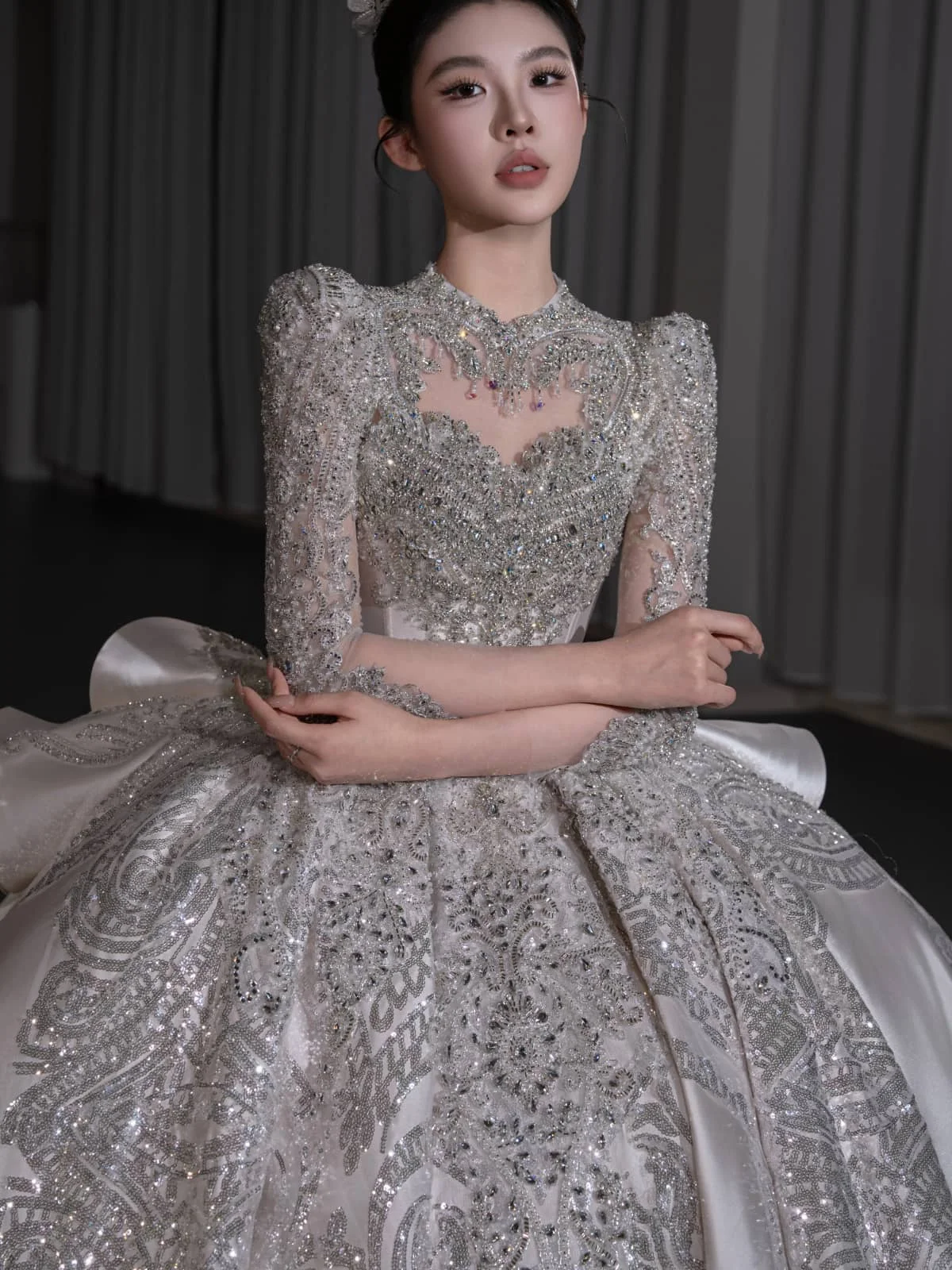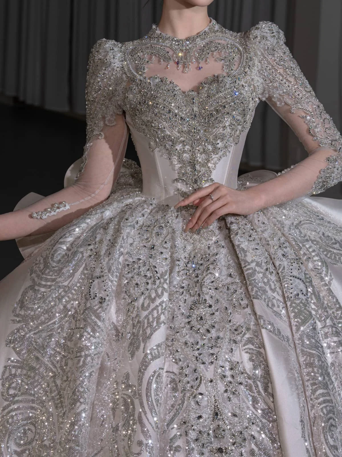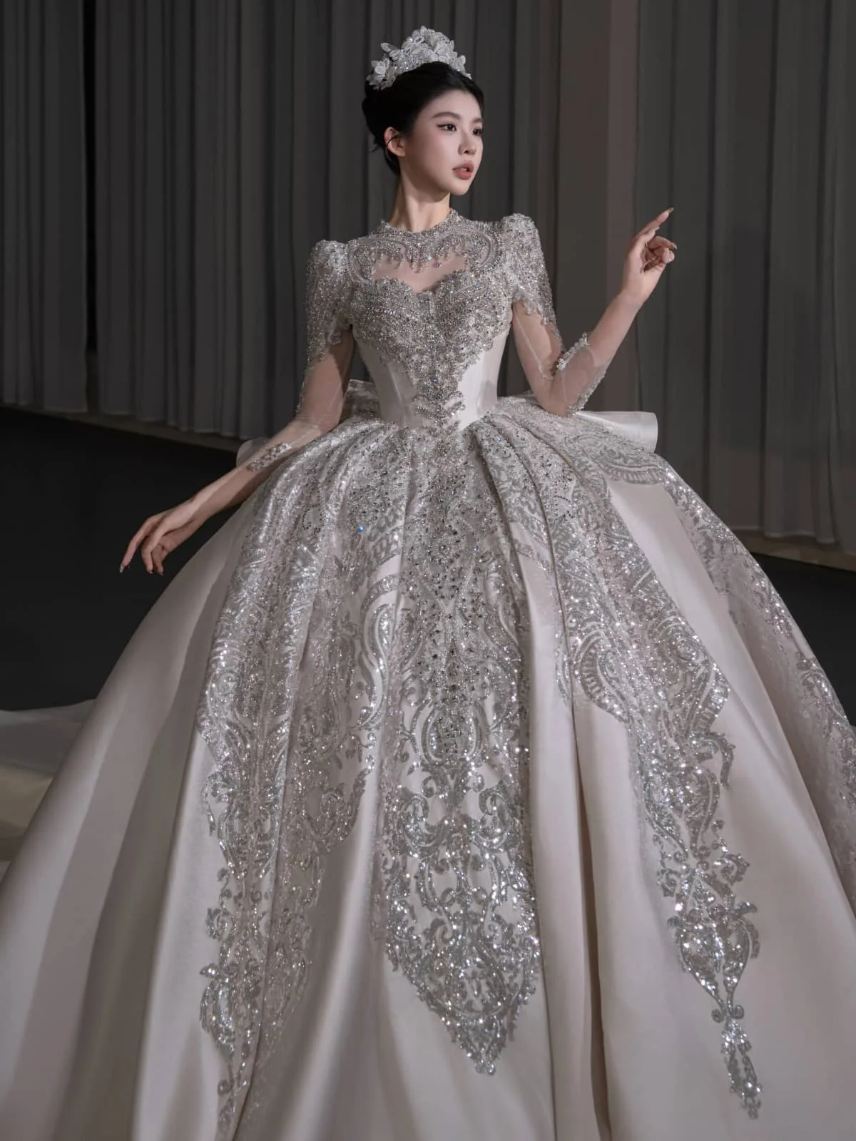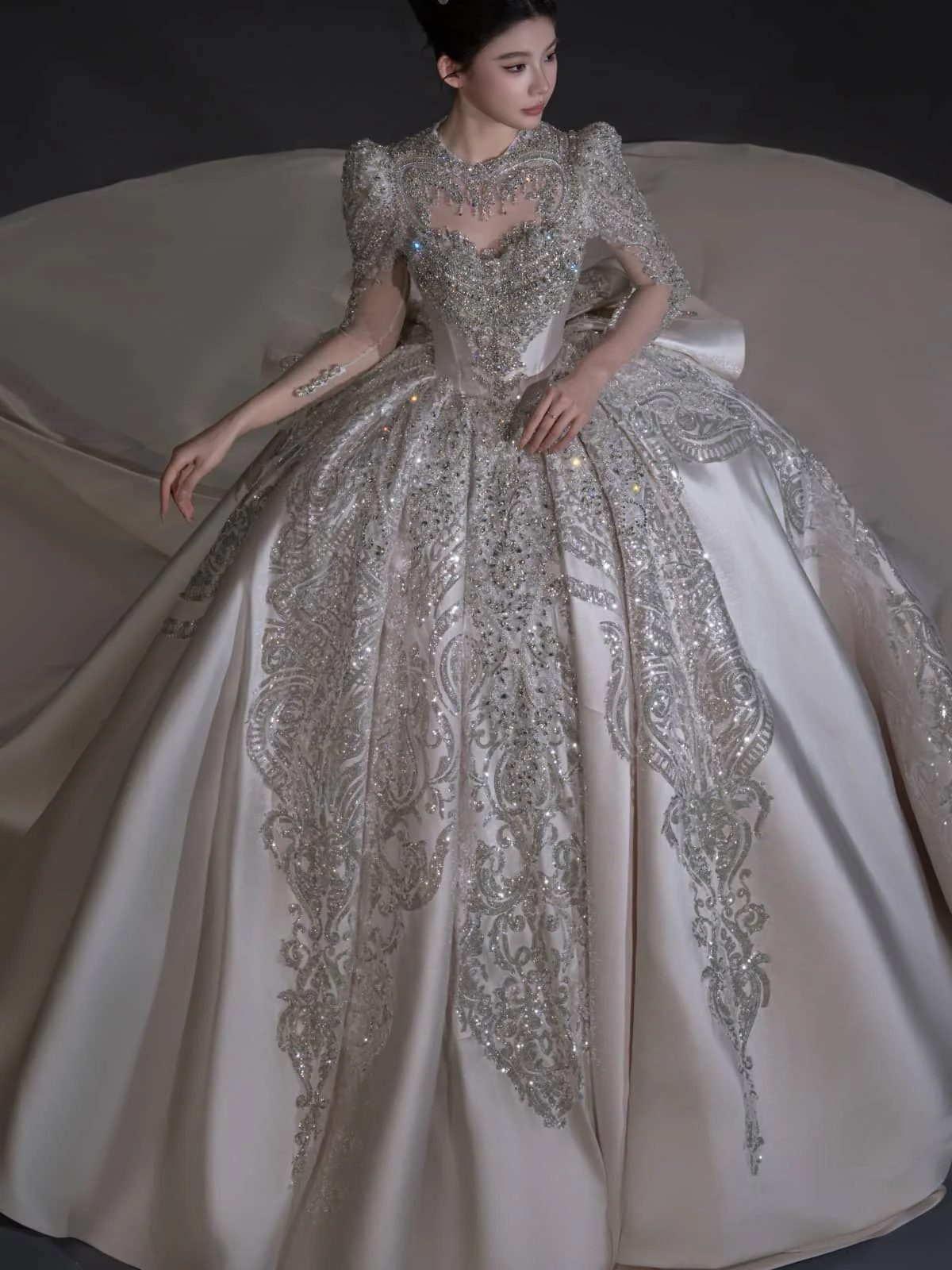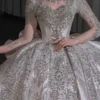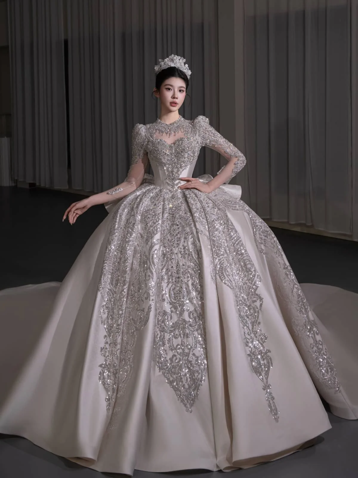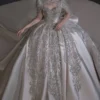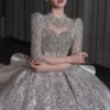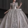 Modern Ivory Wedding Dress Ball Gown Silver Embroidery Long Sleeve Bridal Gown High Fashion Satin Wedding Dress