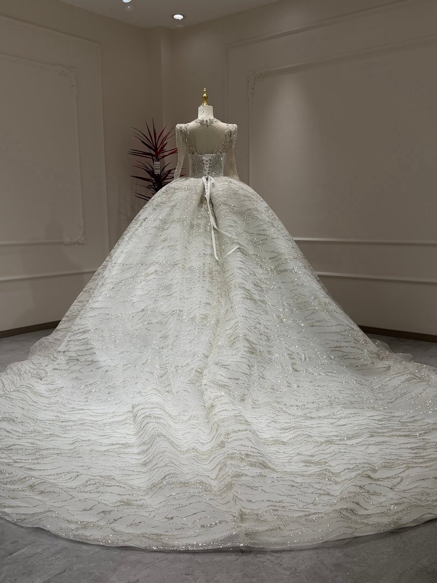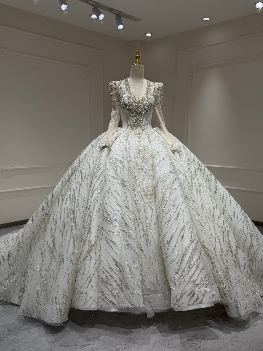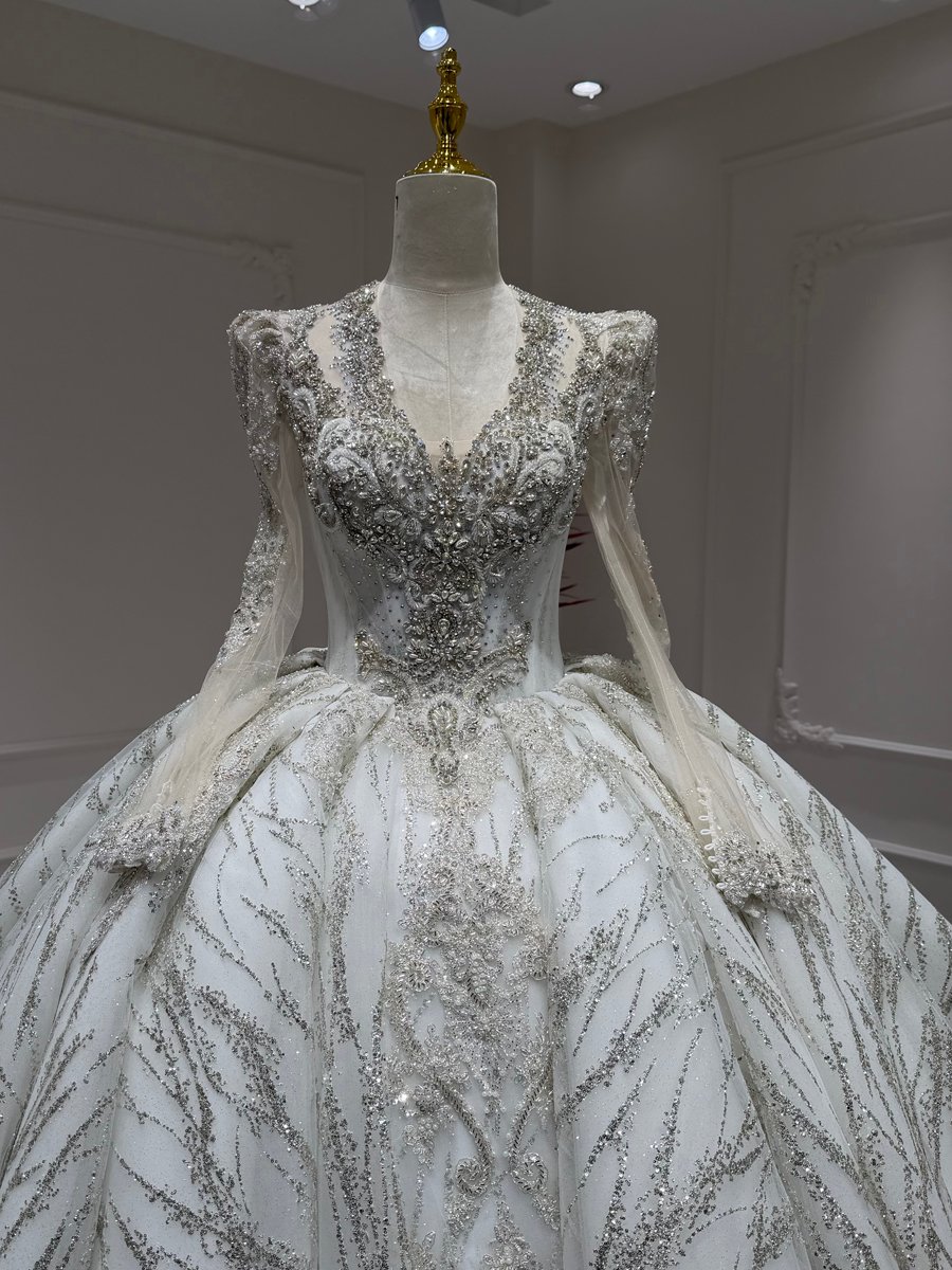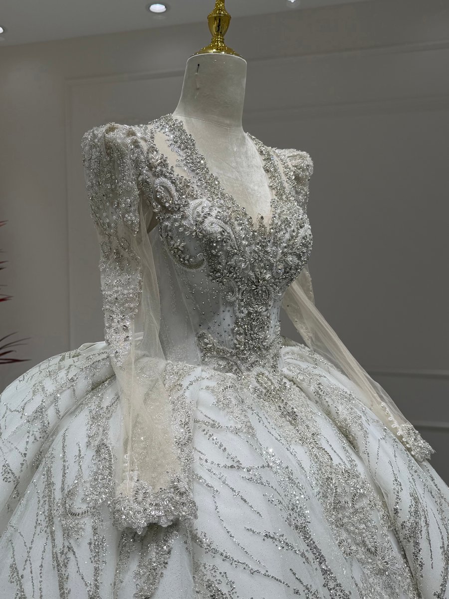 Opulent Ivory Silver Wedding Dress V Neck Ball Gown Glitter Sequin Long Sleeve Bridal Gown Lace Up Back