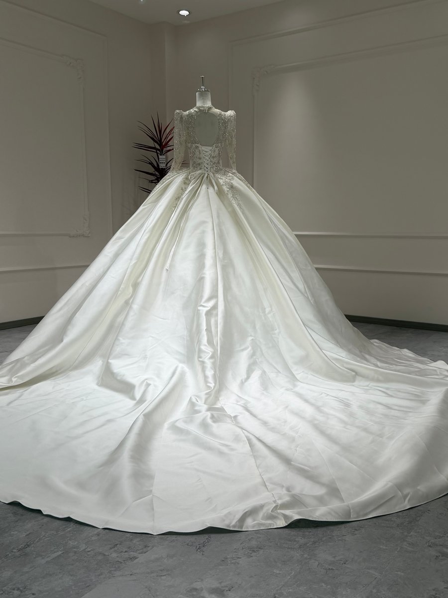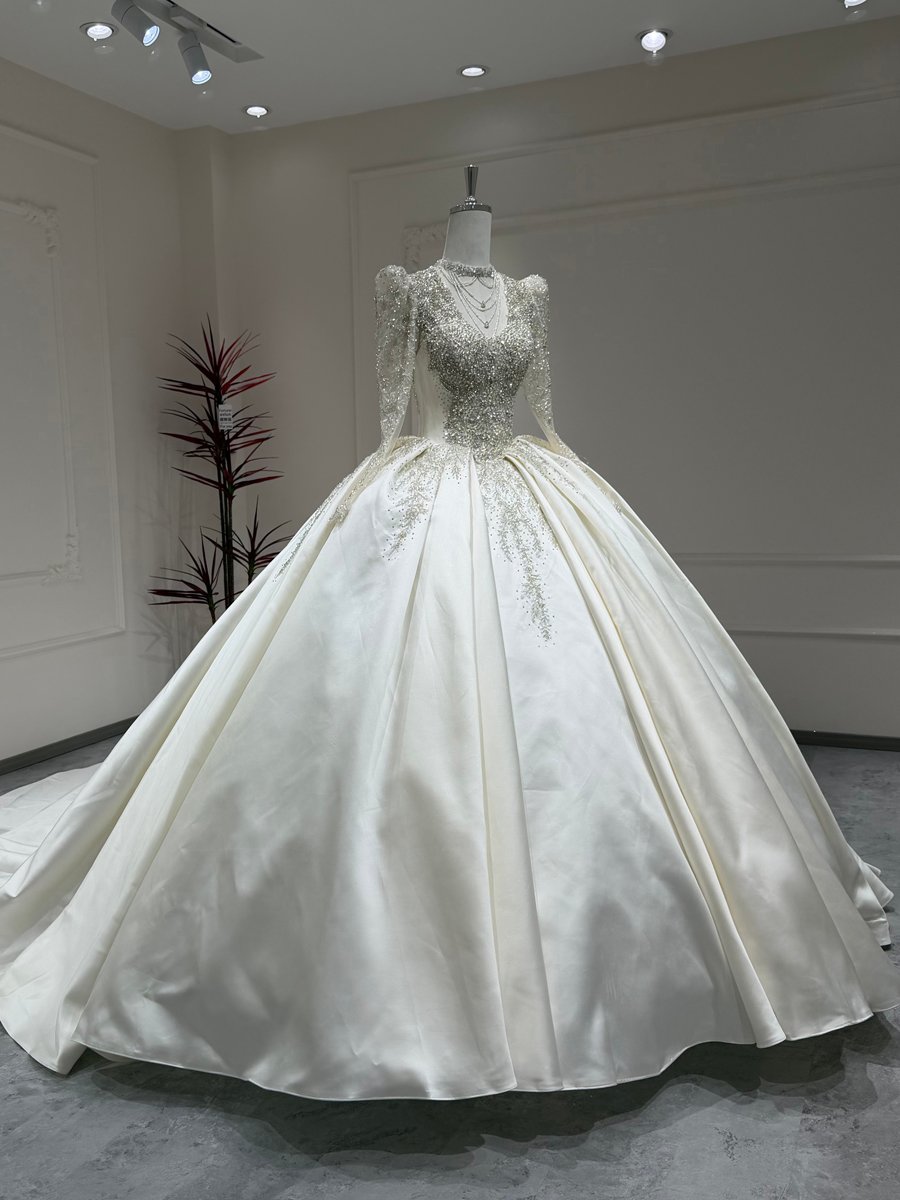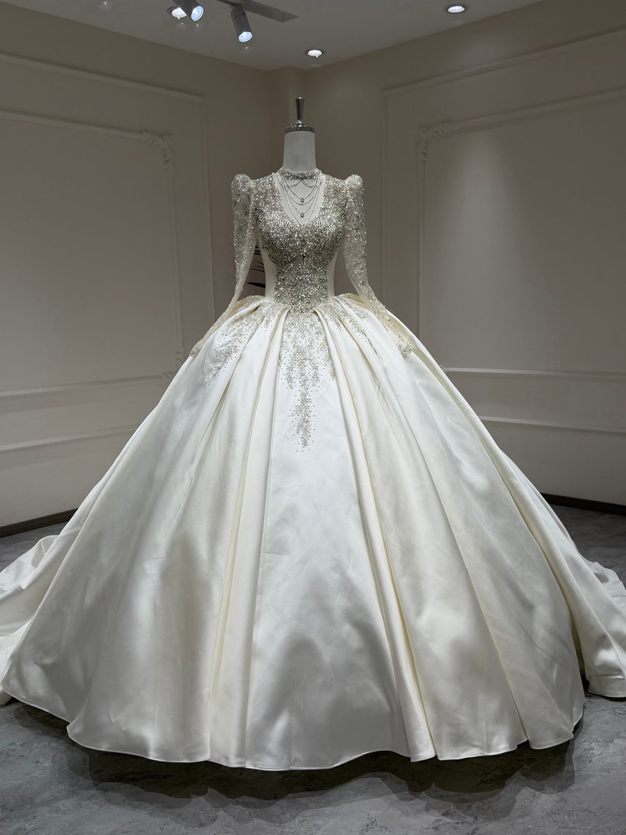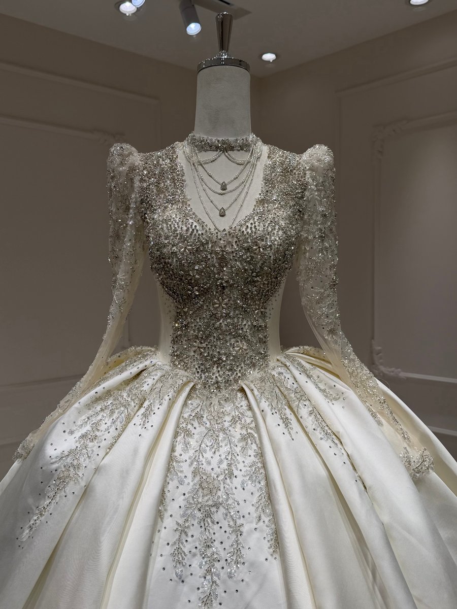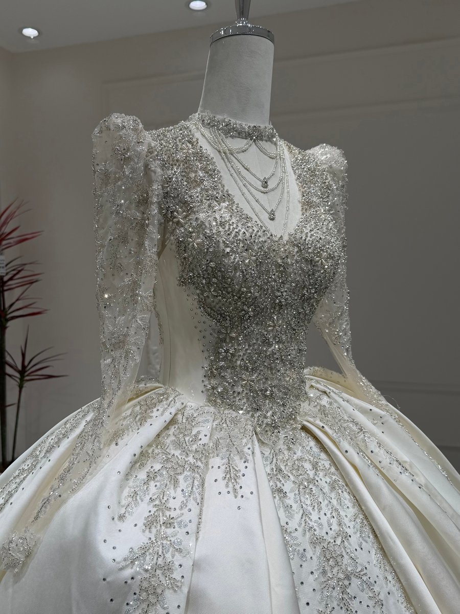 Opulent Ivory Wedding Dress Ball Gown Long Sleeve Beaded Satin Bridal Gown V Neck