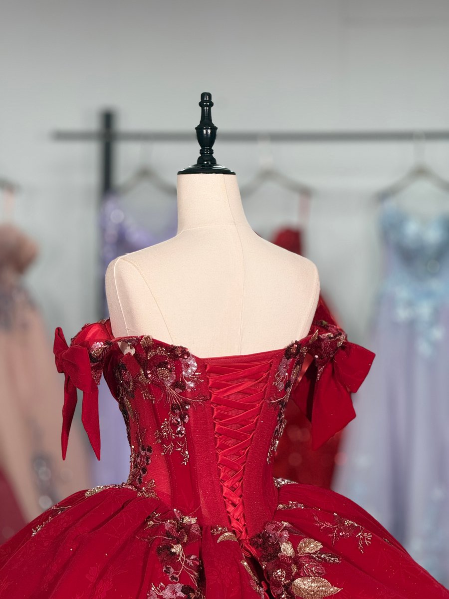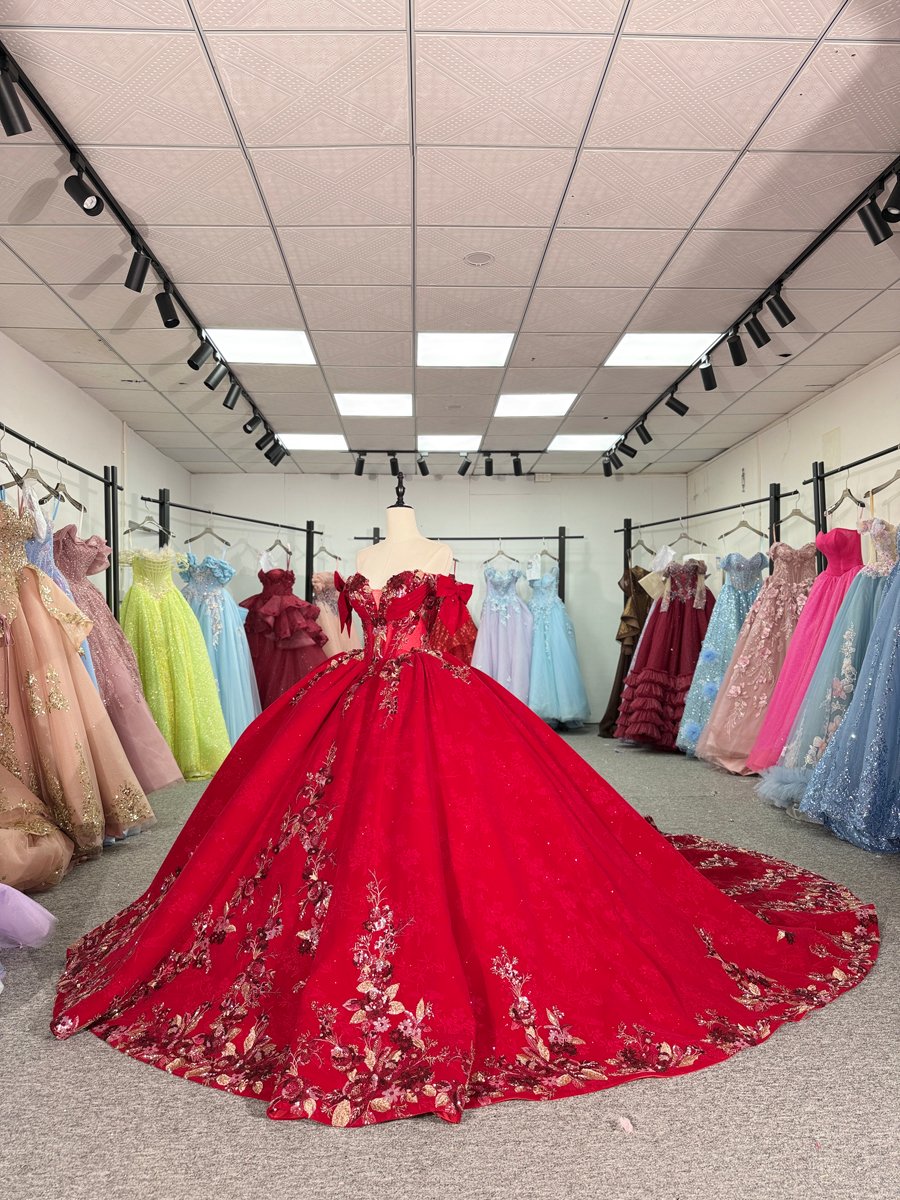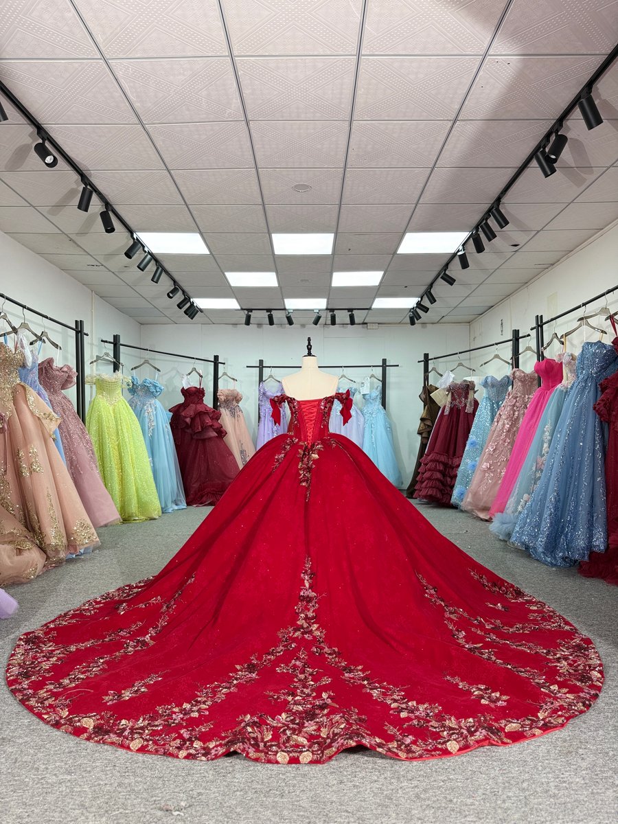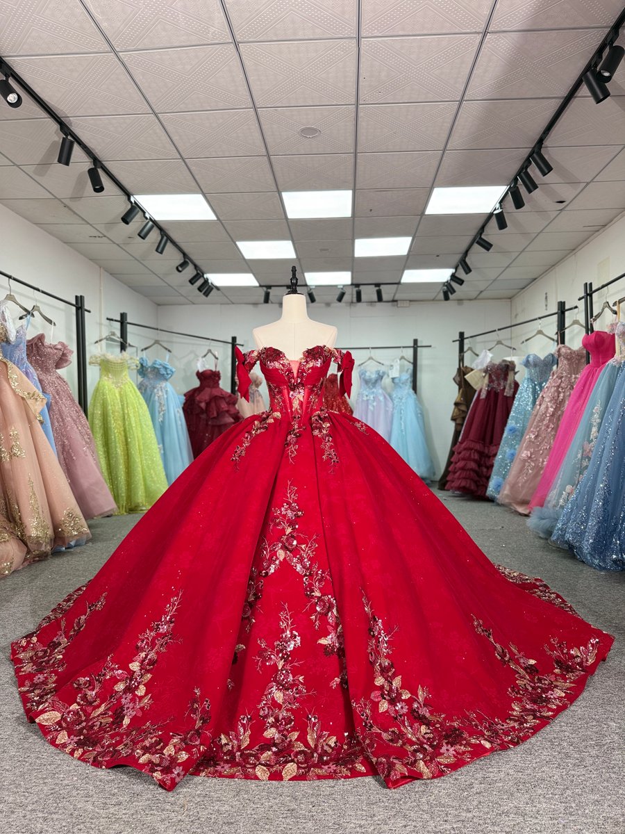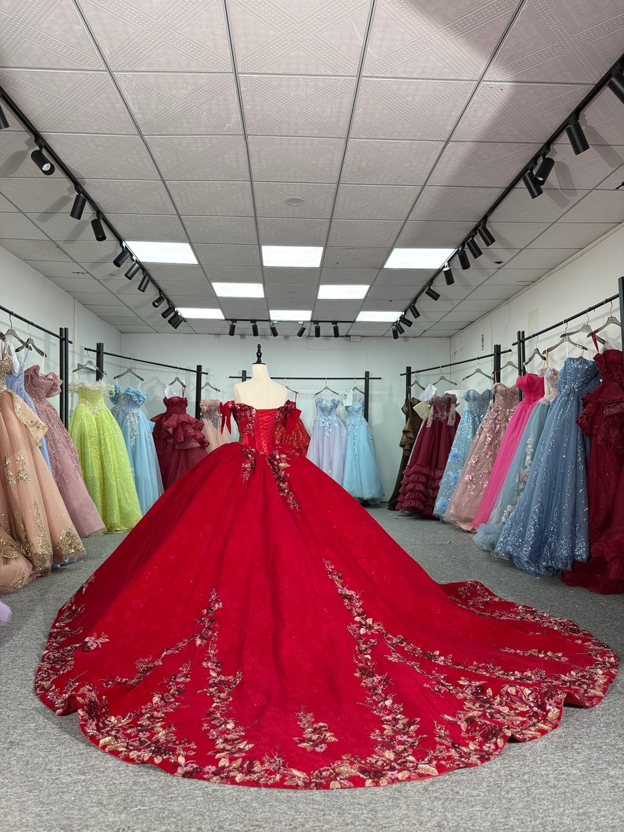 Regal Red Quinceanera Dress Gold Applique Off Shoulder Train Backless Ball Gown Corset Sweet Sixteen Gown