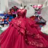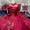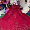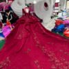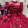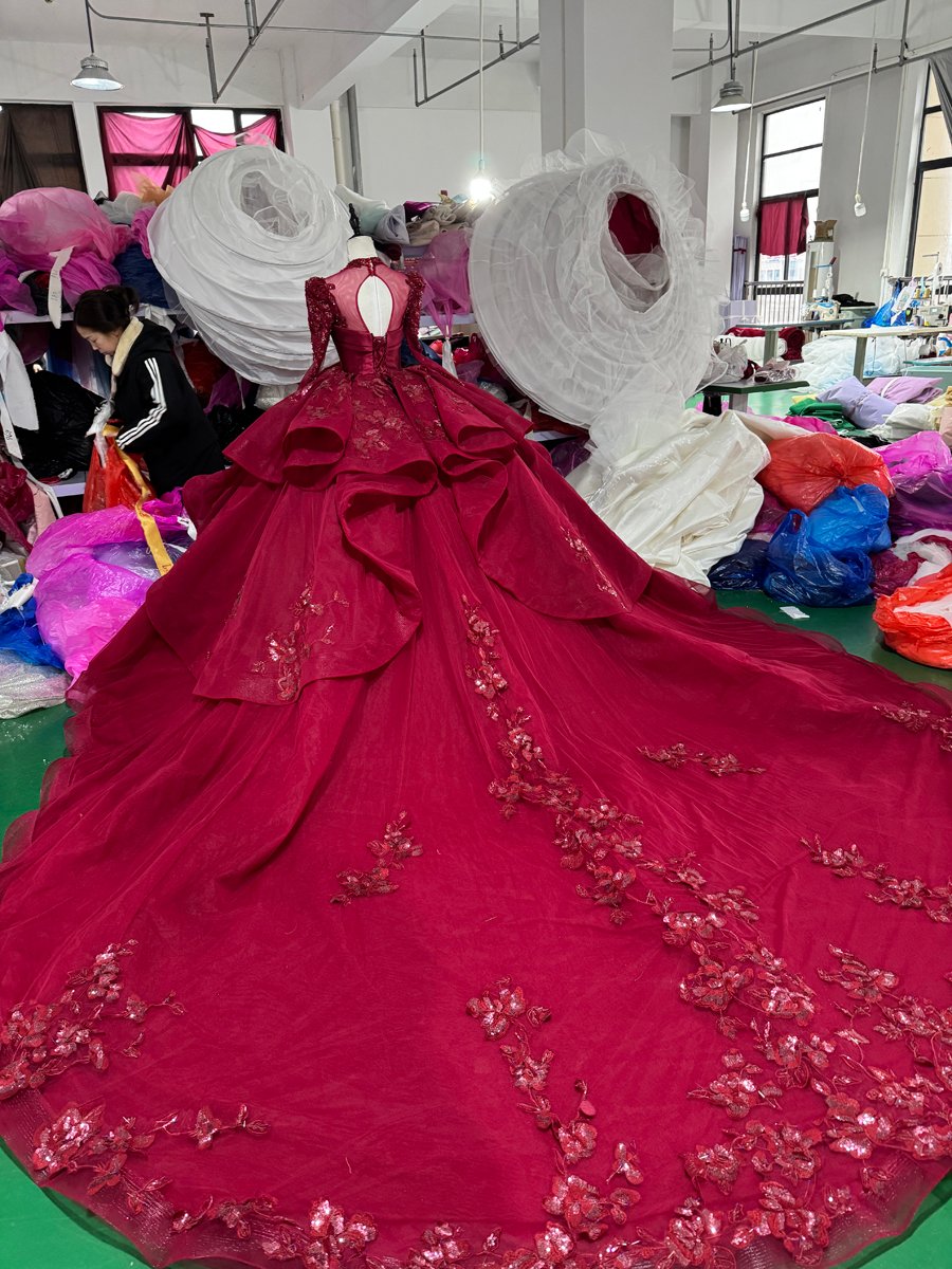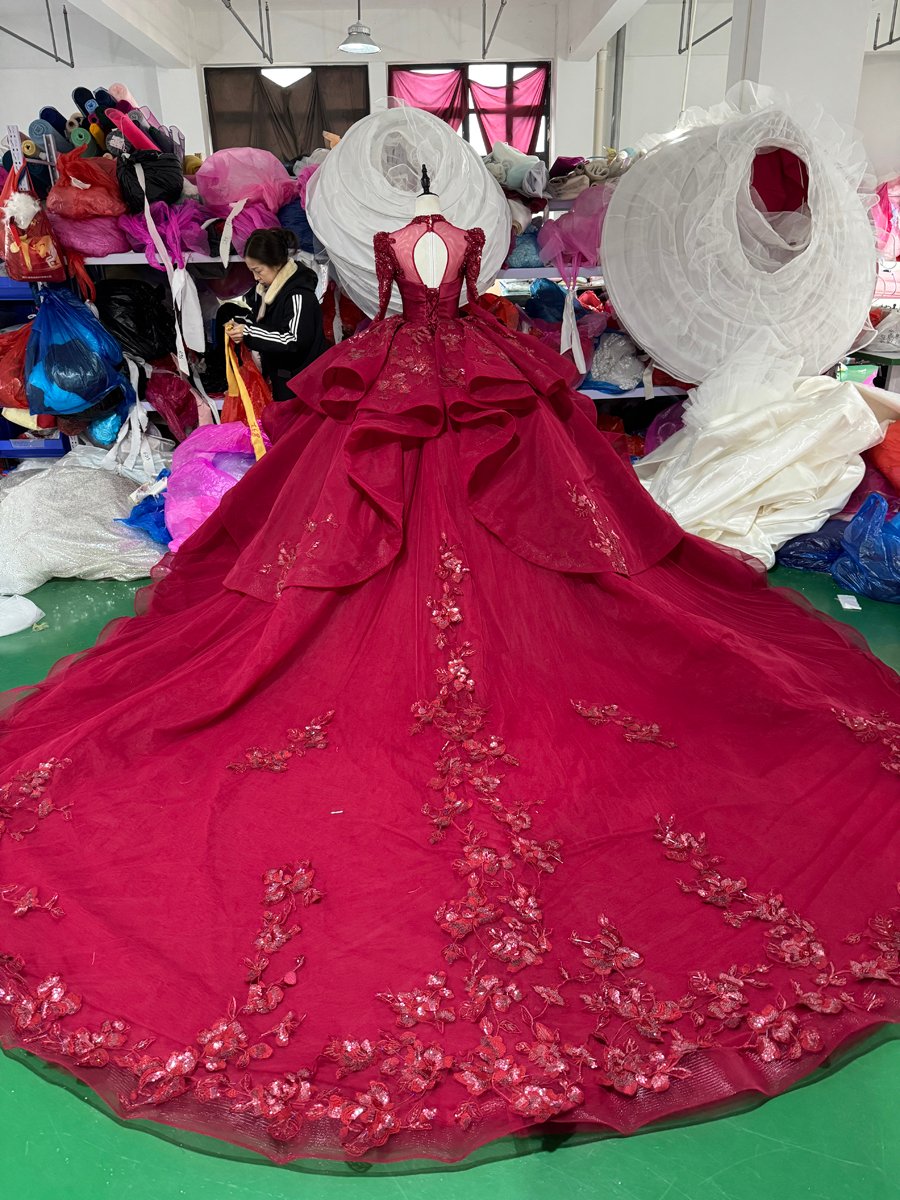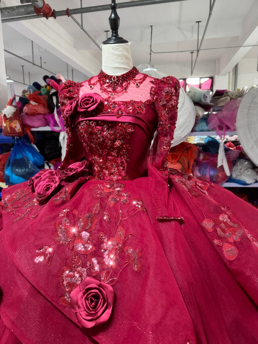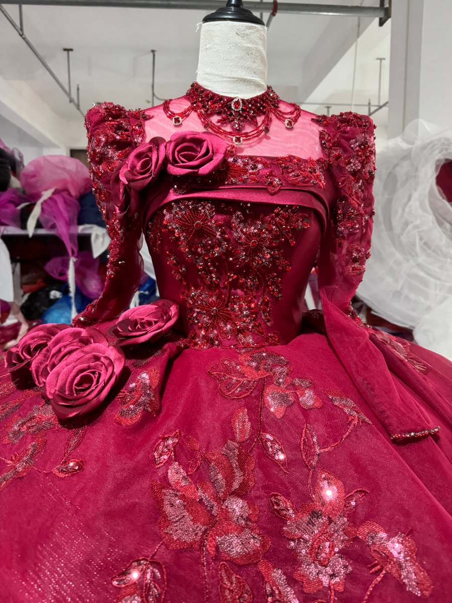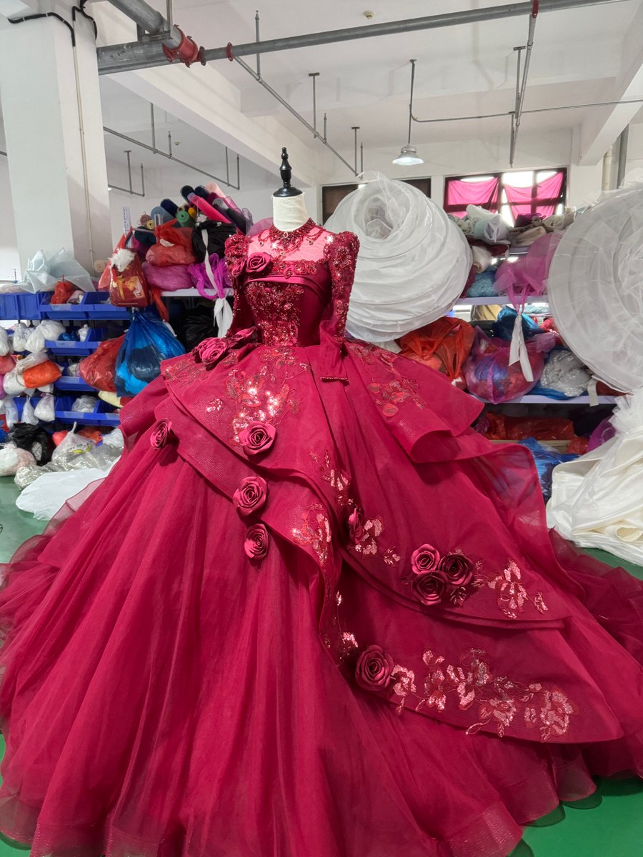 Romantic Wine Red Wedding Dress High Collar 3D Rose Flower Wedding Dress Asymmetric Layered Ball Gown Dramatic Bridal Gown