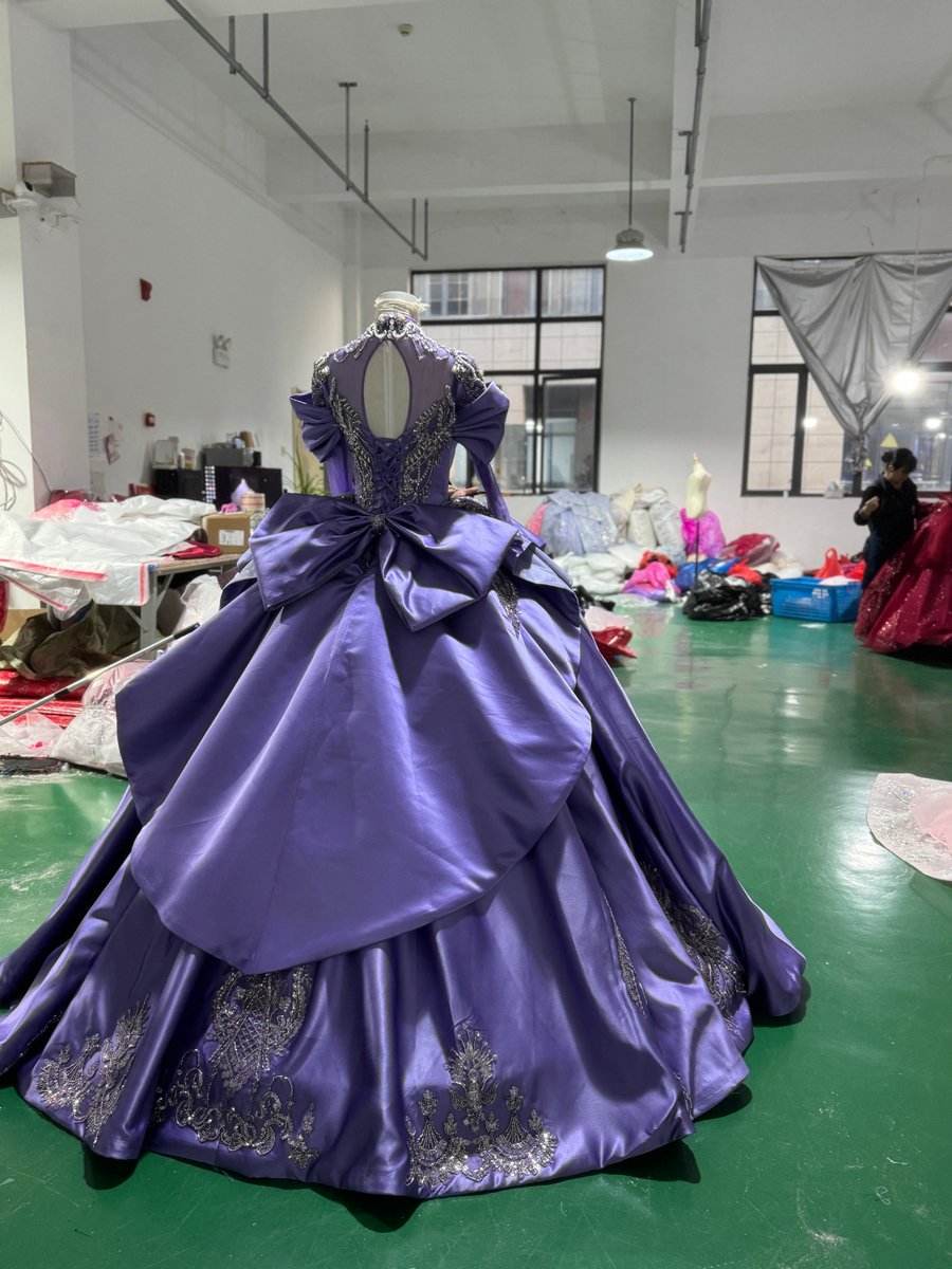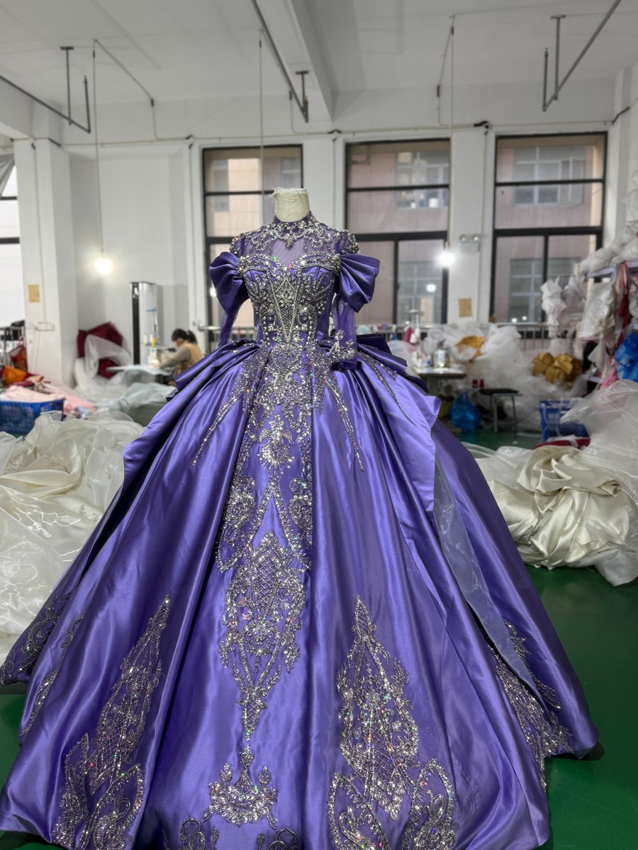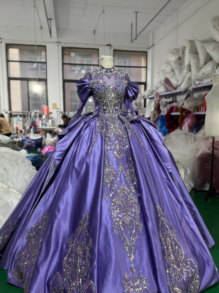 Royal Purple Sequin Beaded High Neck Quinceanera Dress Long Sleeve Ball Gown Keyhole Back Gown