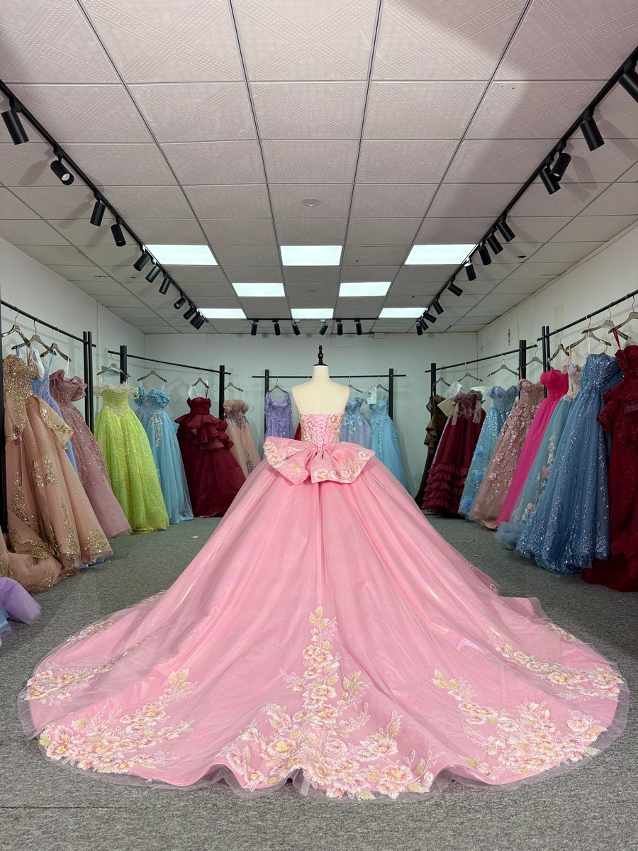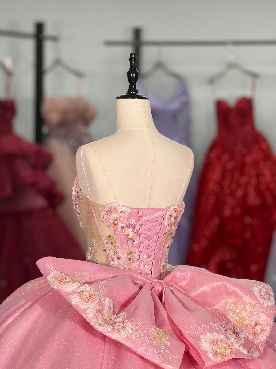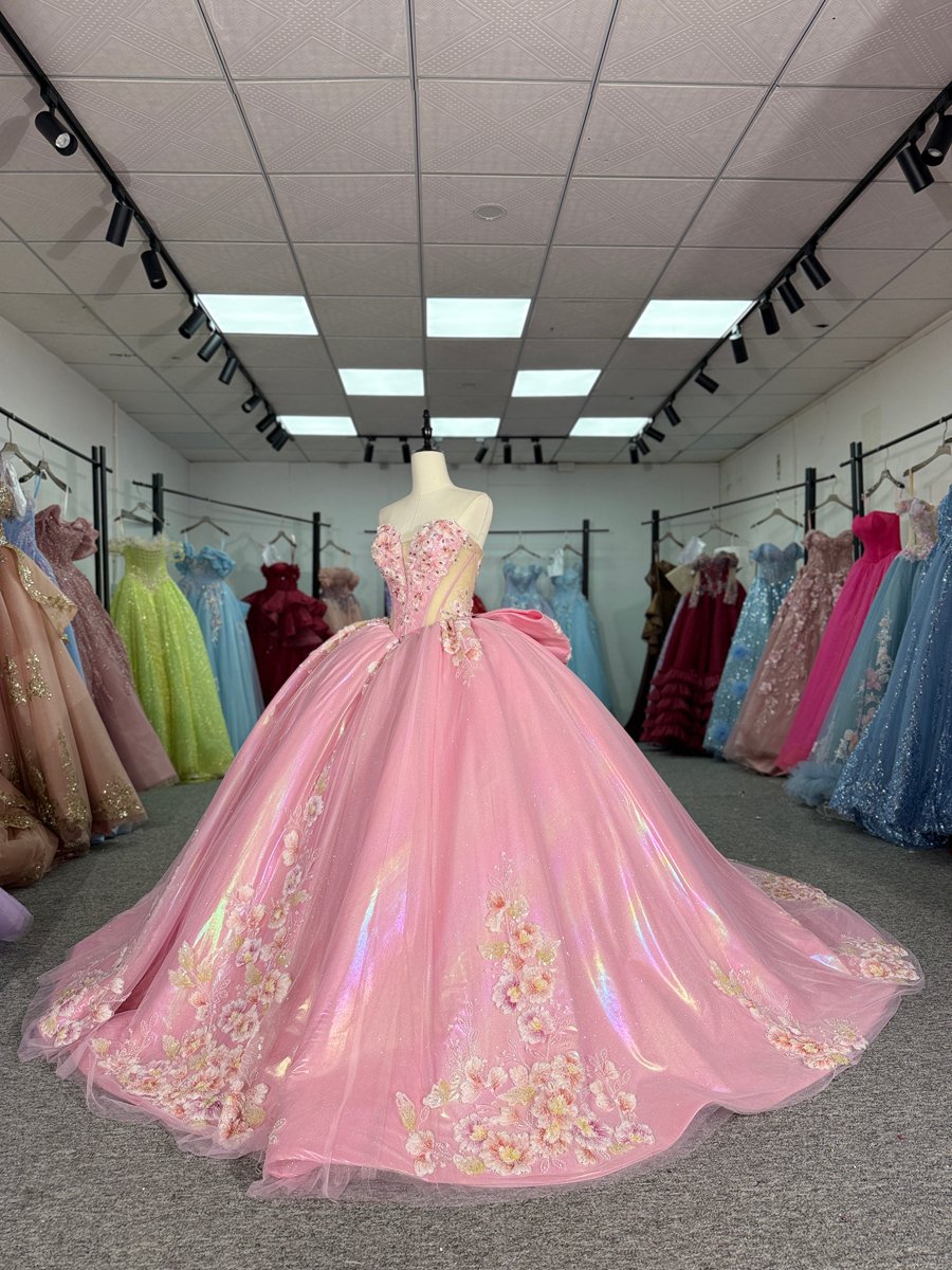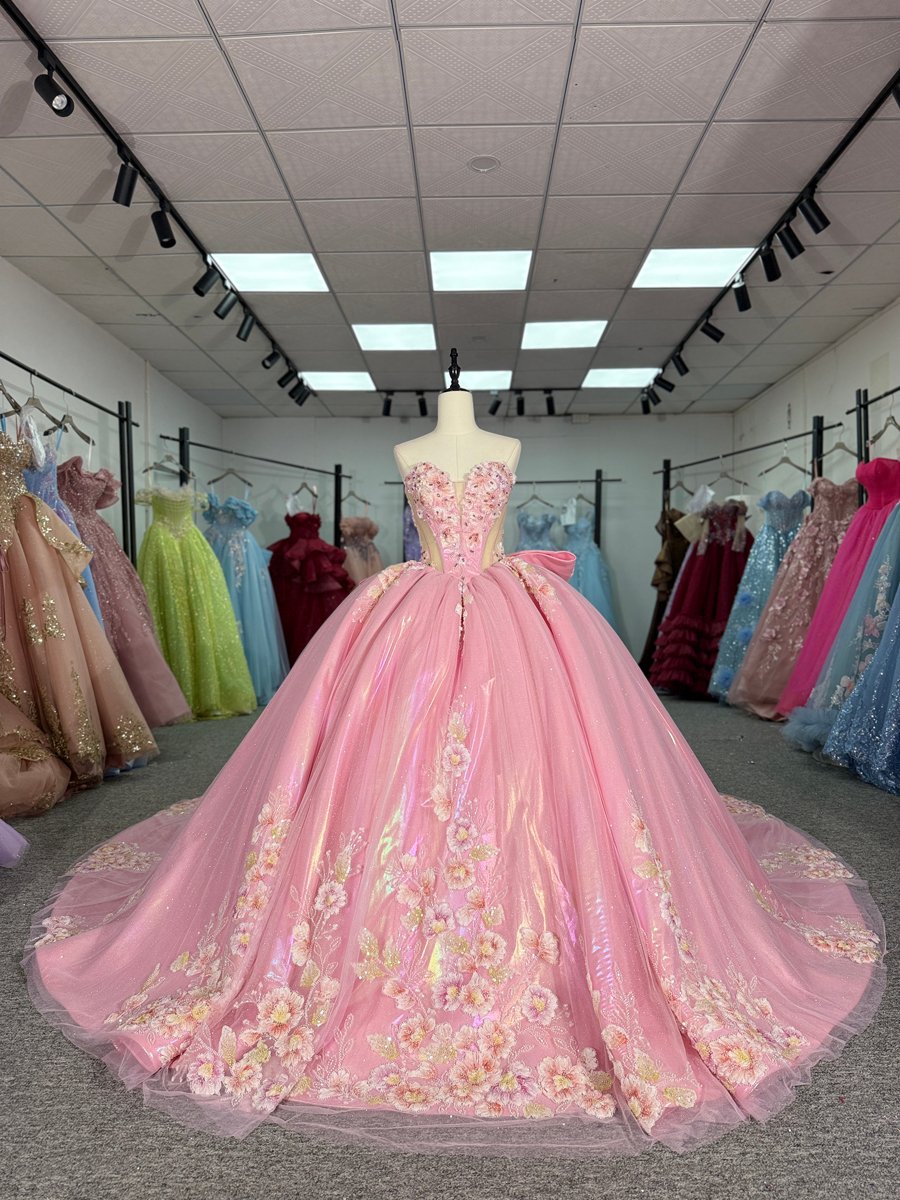 Shimmering Pink Floral Embroidered Sweetheart Quinceanera Dress Bow Back Lace Up Ball Gown Sparkle Princess Gown