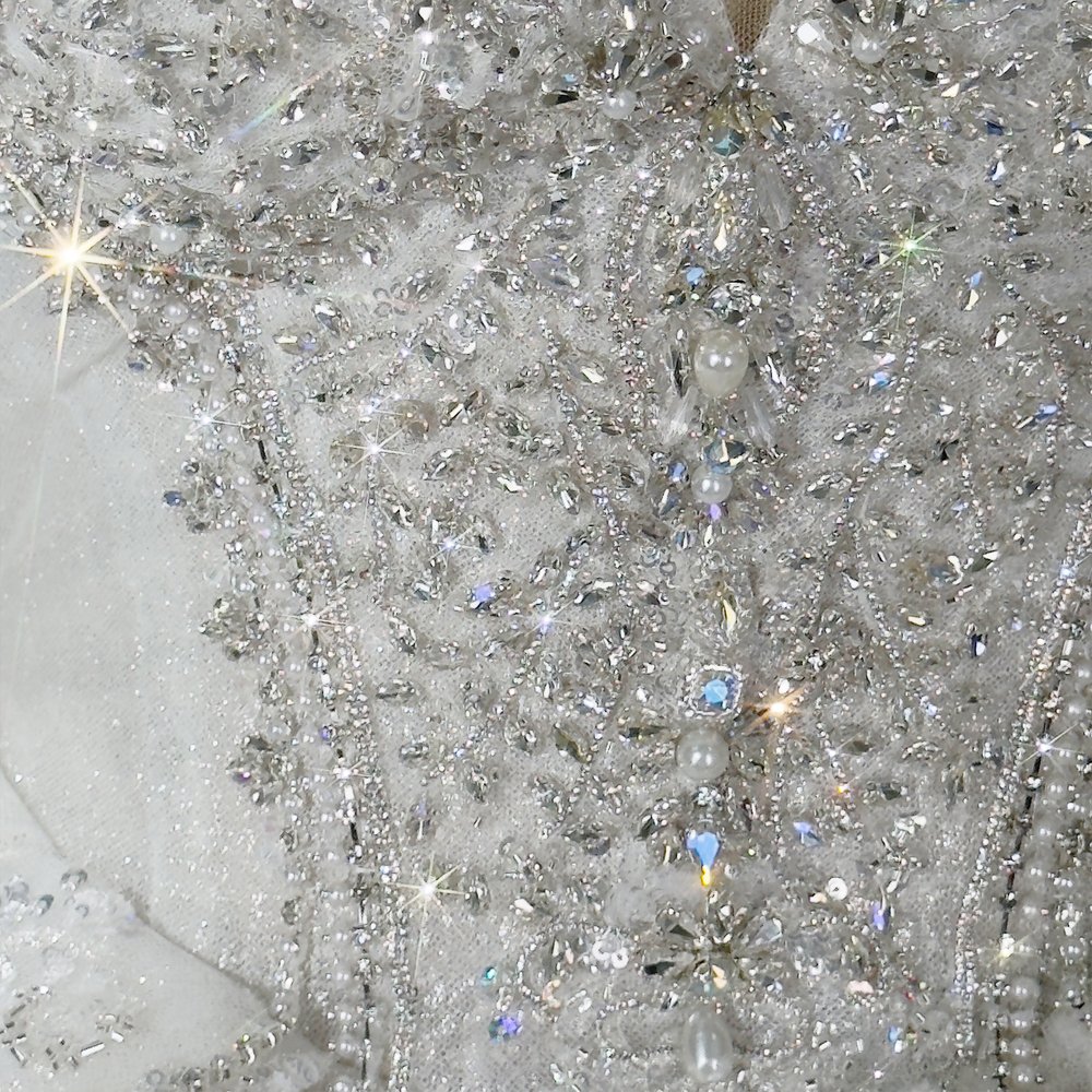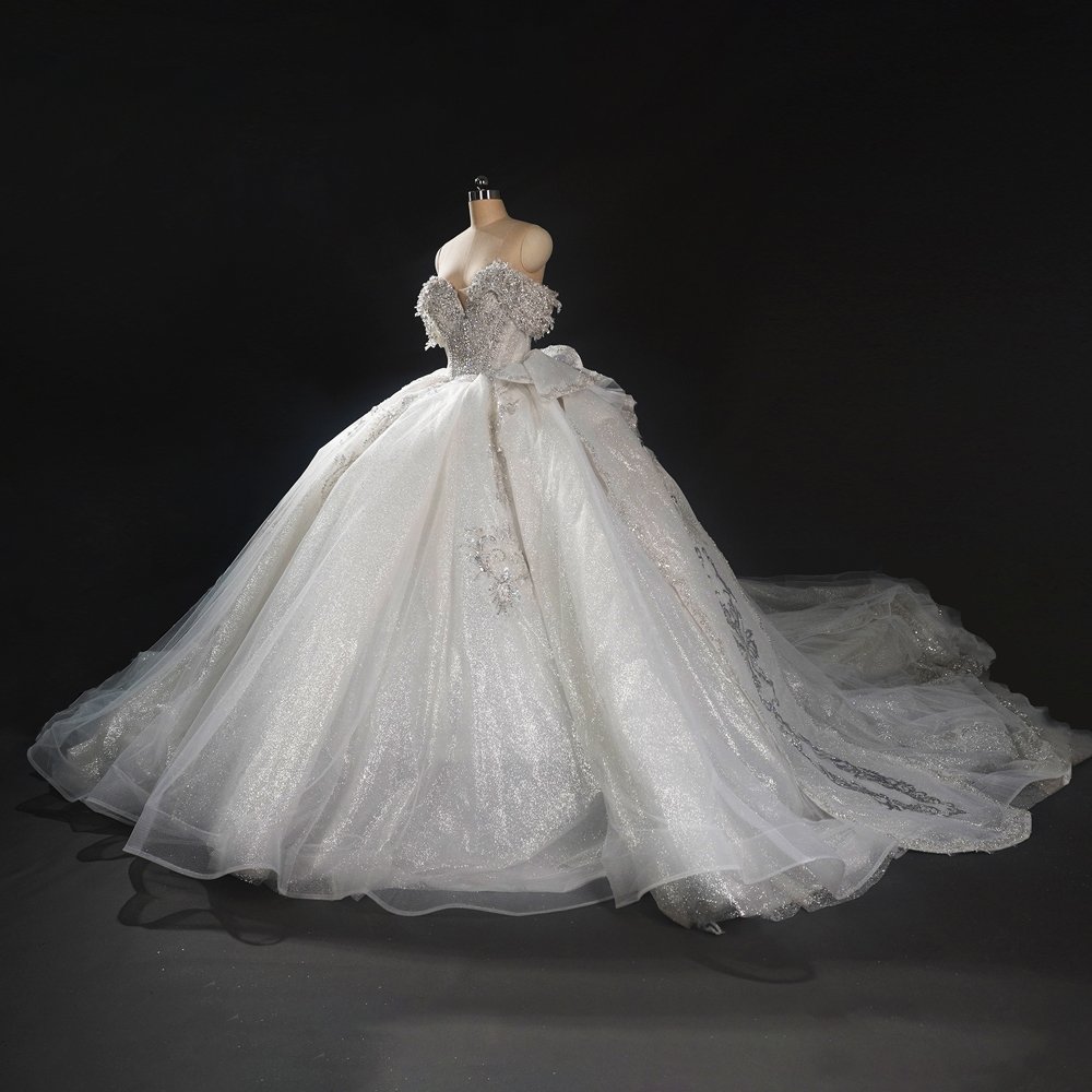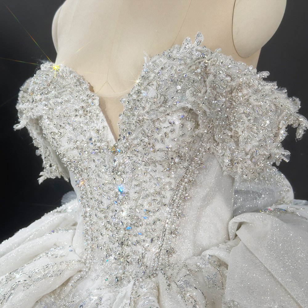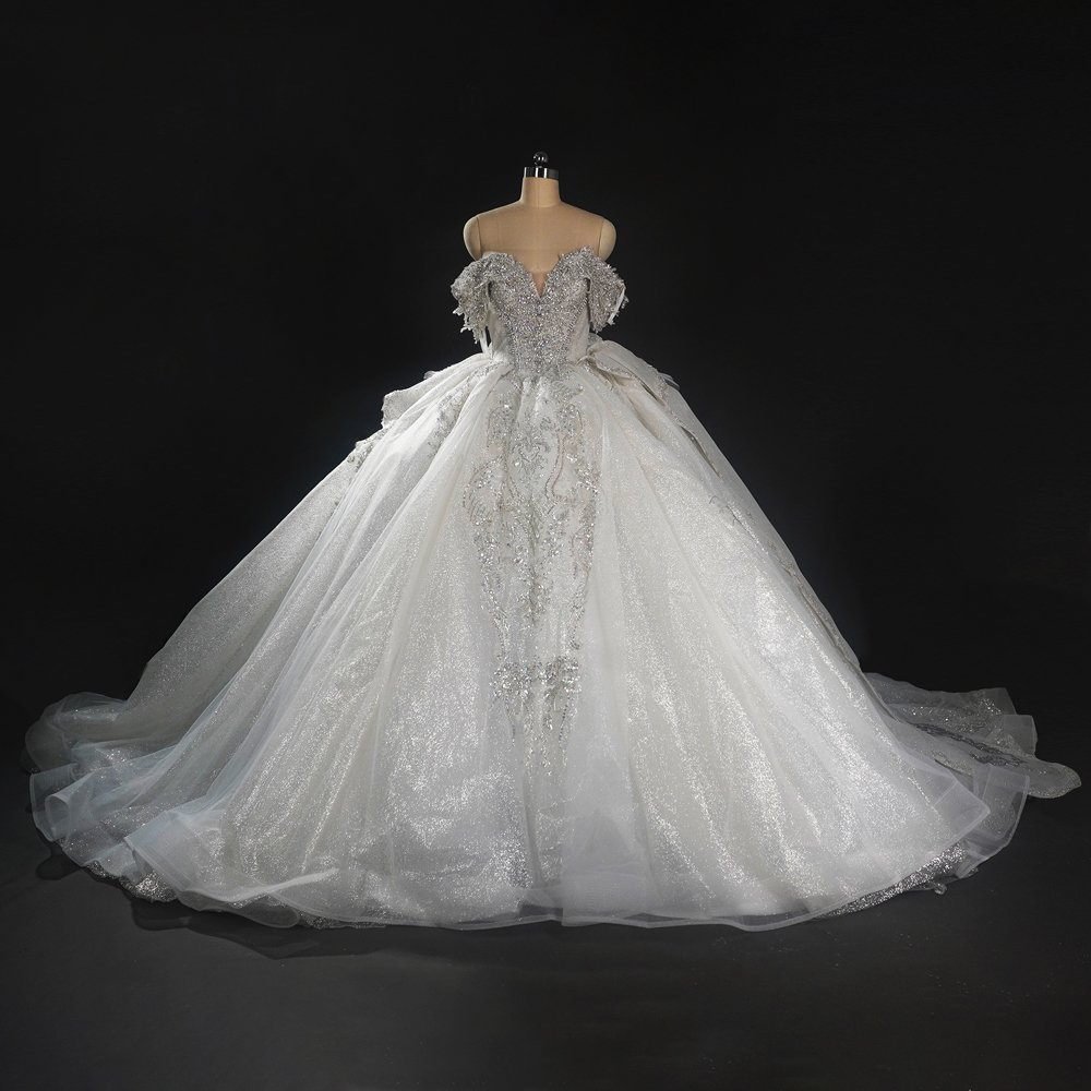 Sparkling Bejeweled Ivory Off Shoulder Ball Gown Wedding Dress Long Trailing Gown Bridal Dress