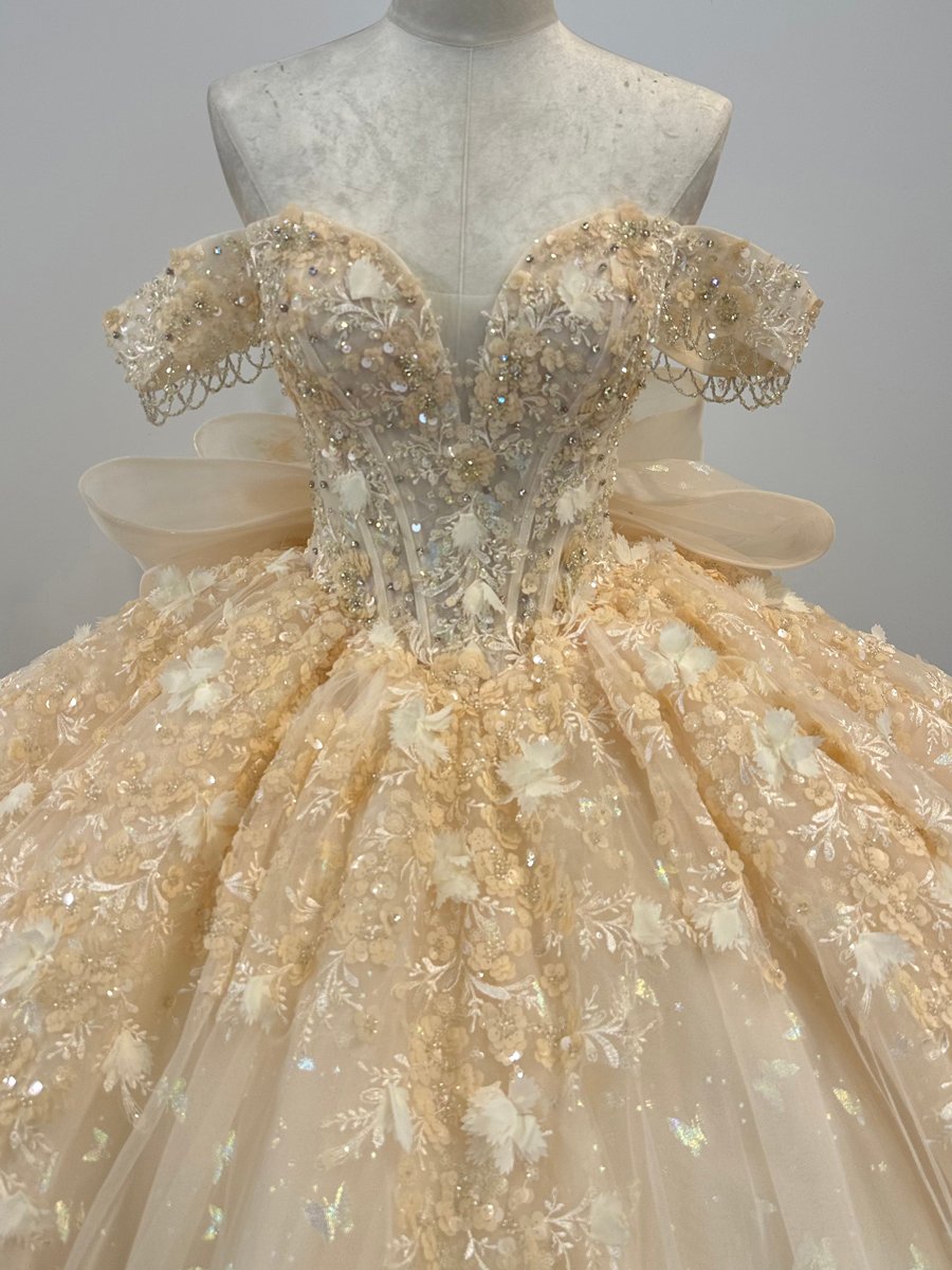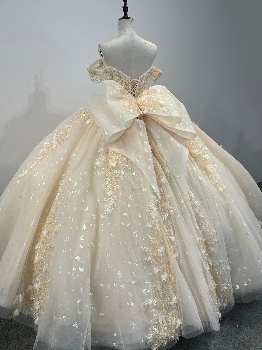 Sparkling Champagne Floral Butterfly Quinceanera Dress Off Shoulder Bow Ball Gown Corset Sweet Sixteen Gown