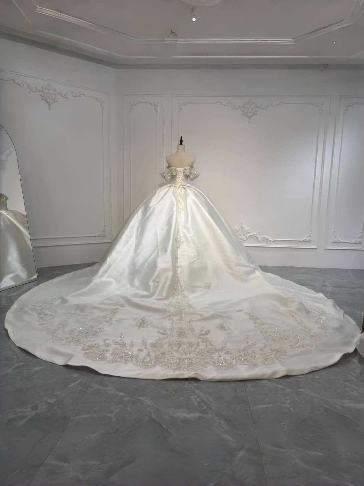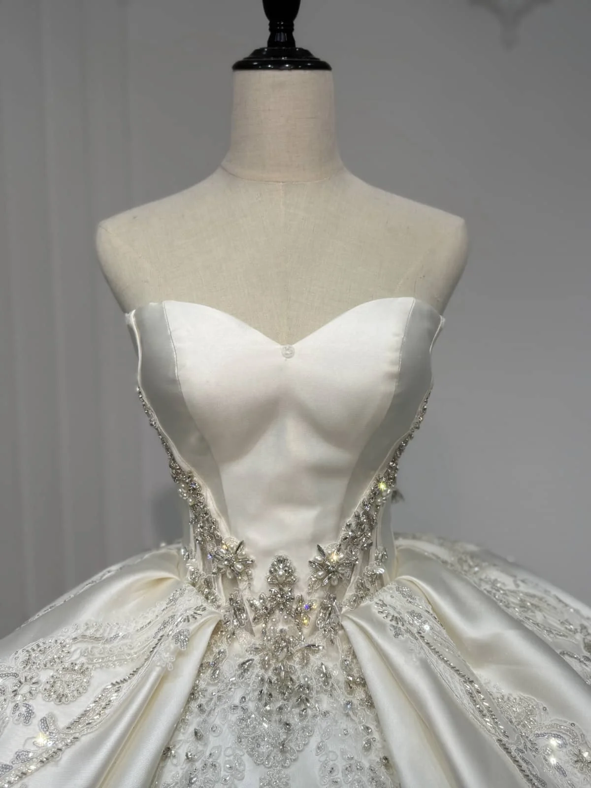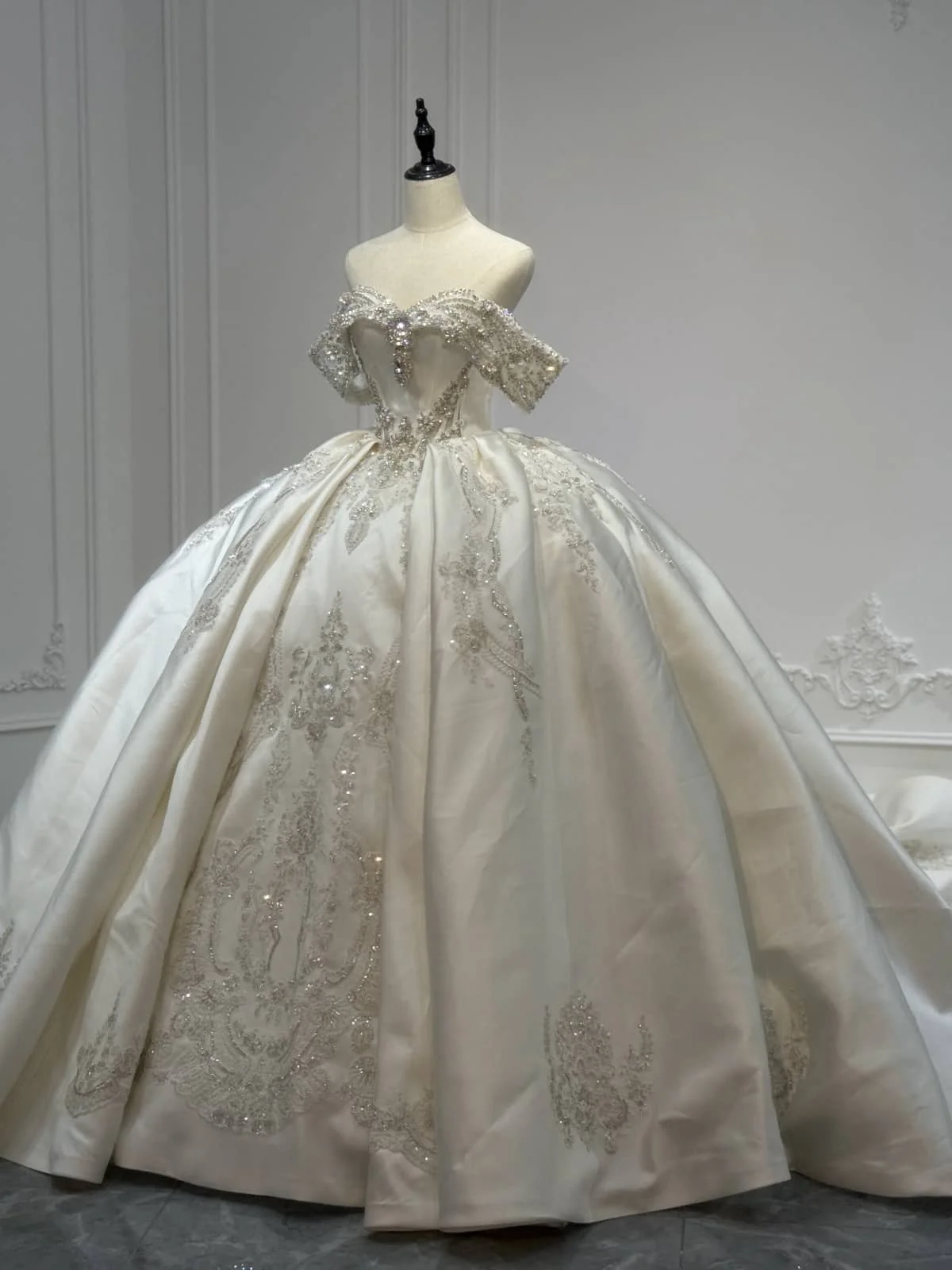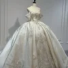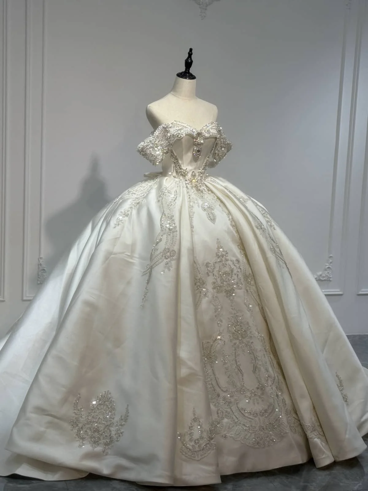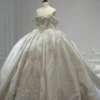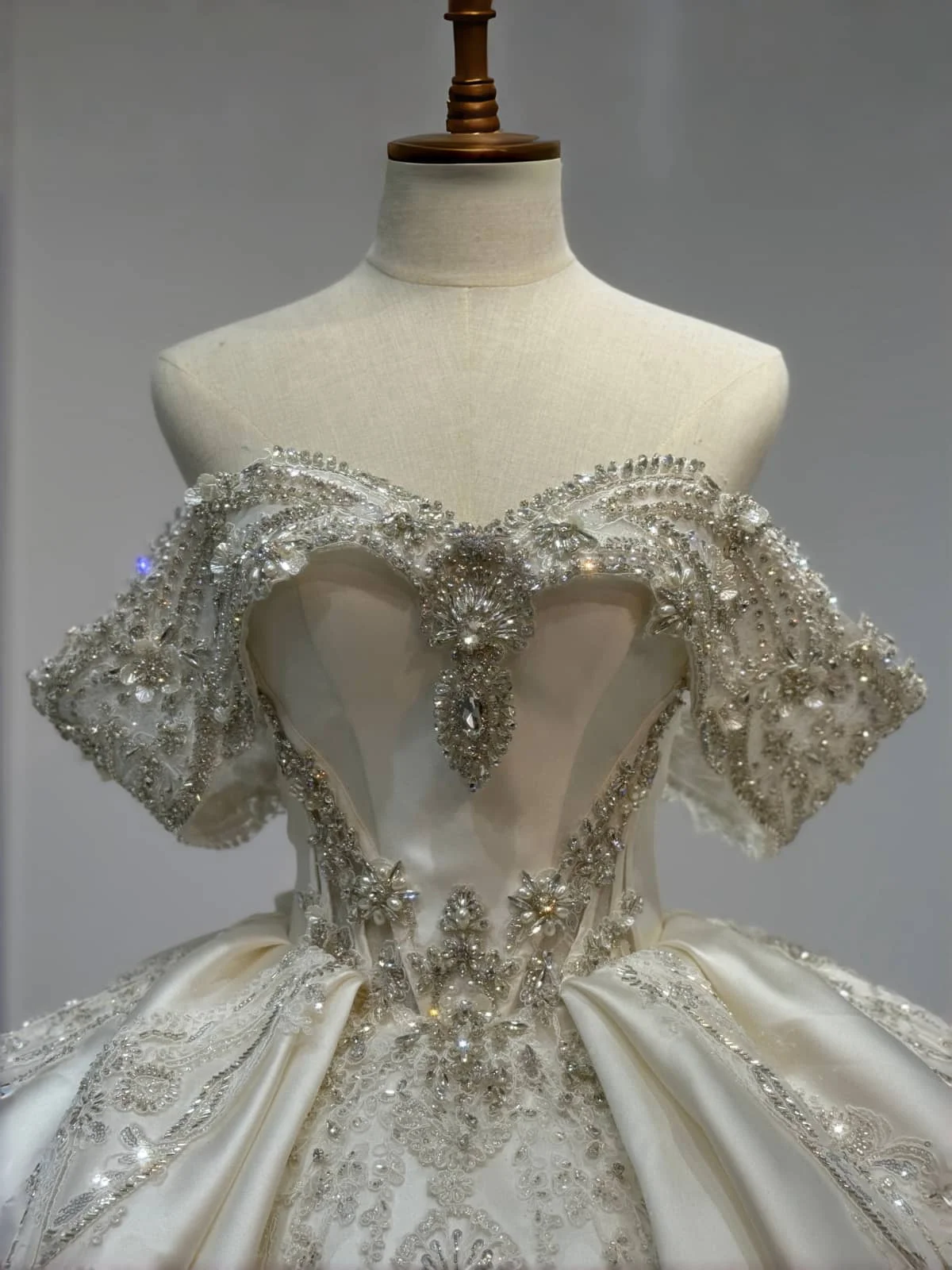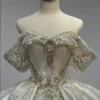 Sparkling Off Shoulder Royal Wedding Dress Satin Ball Gown Crystal Train 2 in 1 Bridal Gown