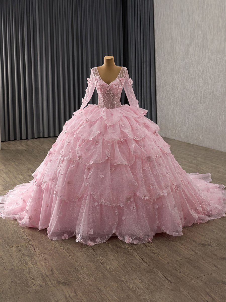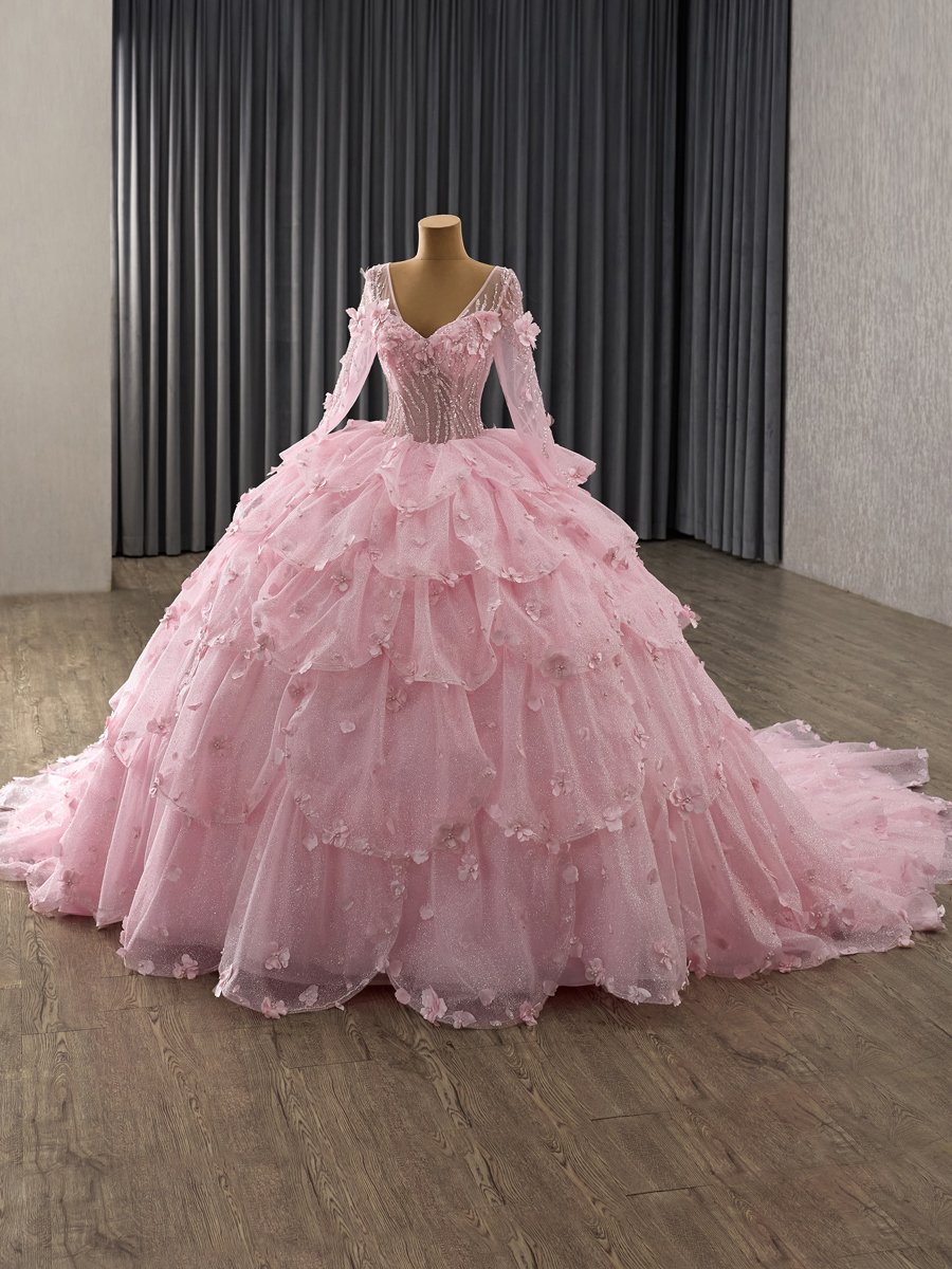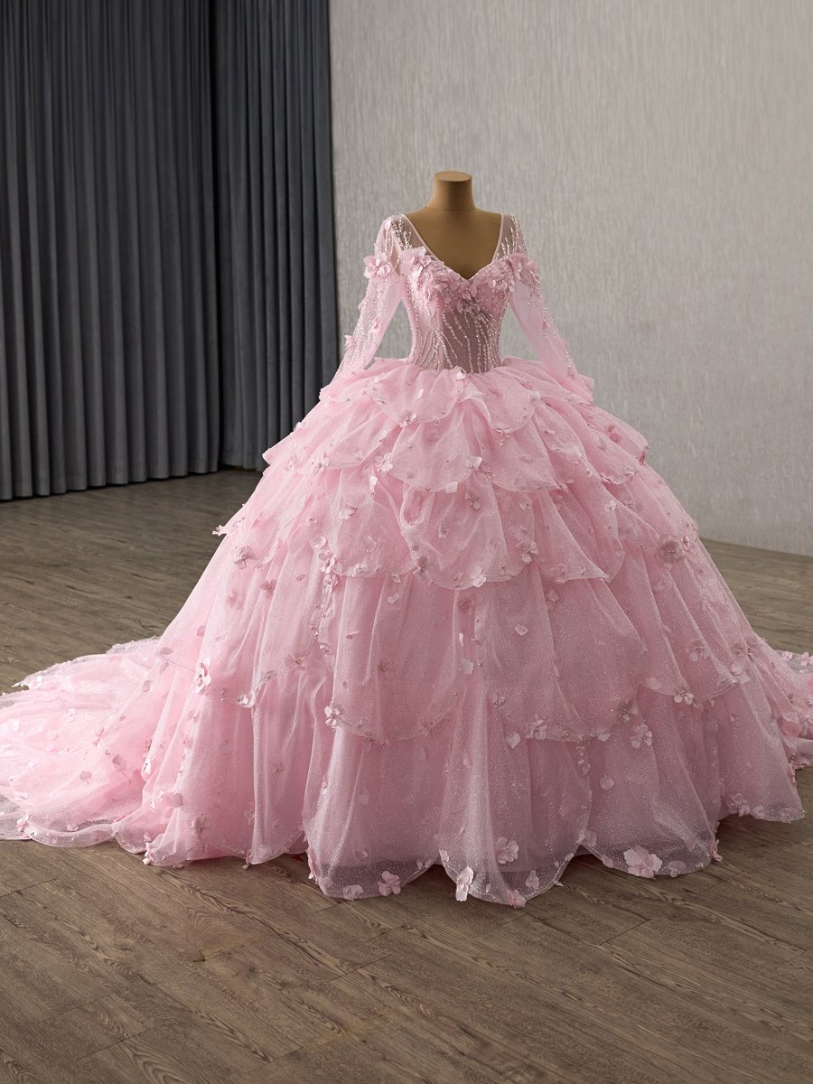 Sparkling Pink Quinceanera Dress Ball Gown Long Sleeve Floral Tiered Sweet 16 Dresses