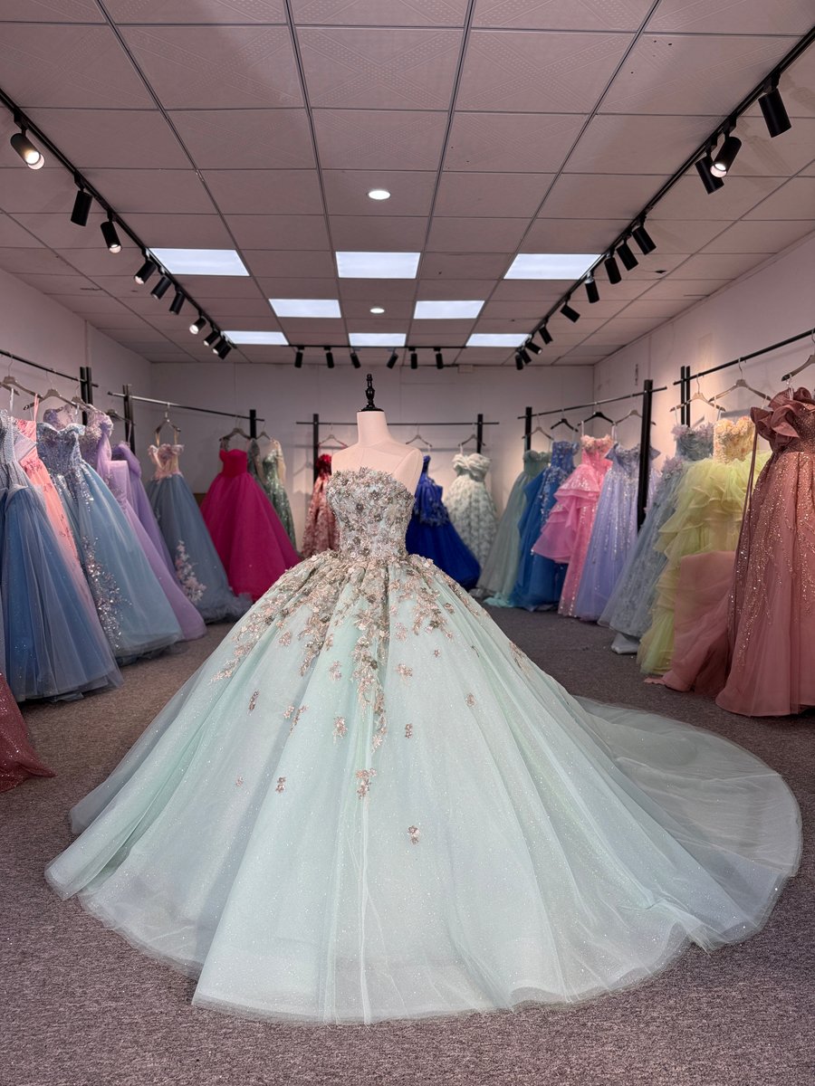 Sparkly Mint Green Strapless Quinceanera Dress Beaded Lace Applique Ball Gown Sweet 15 Gowns