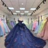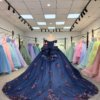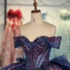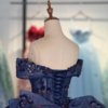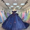 Stunning Deep Blue Quinceanera Dress Floral Applique Off Shoulder Corset Back Quinceanera Gown With Glitter Tulle And Ruffled Train