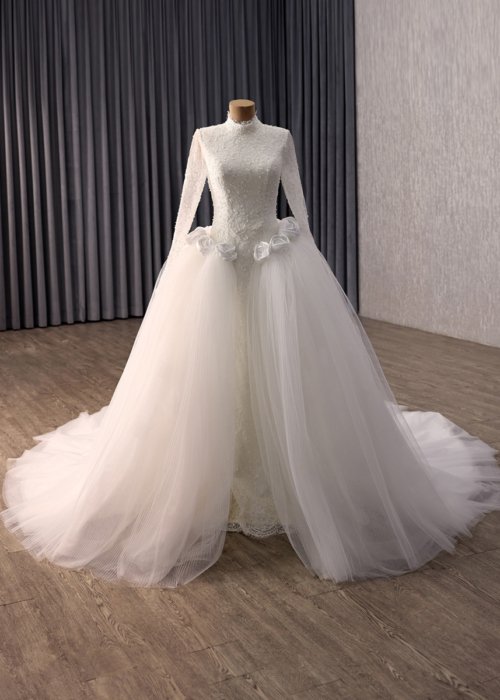 • Luxury Ivory 2 in 1 Mermaid Wedding Dress Long Sleeve Beaded Ball Gown Wedding Gown Cathedral Train Elegant Bridal Dress