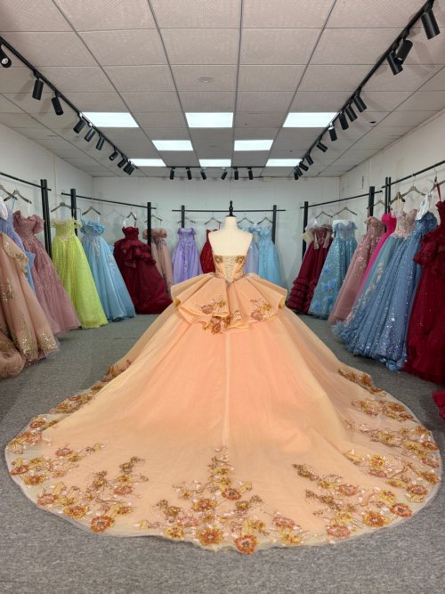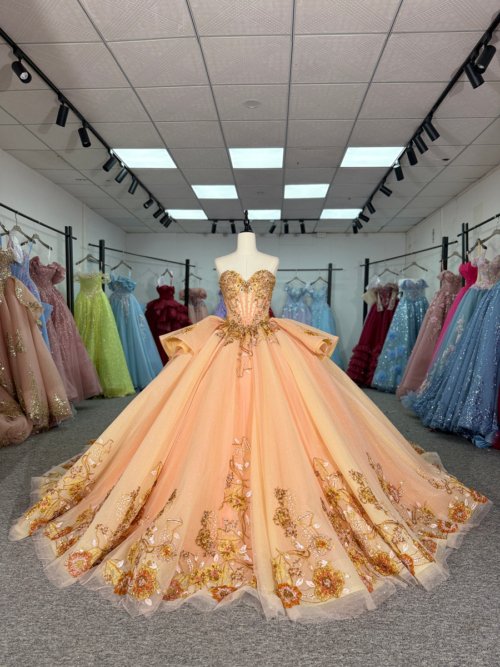 • Elegant Peach Gold Quinceanera Dress Ball Gown Sweetheart Off Shoulder Long Train