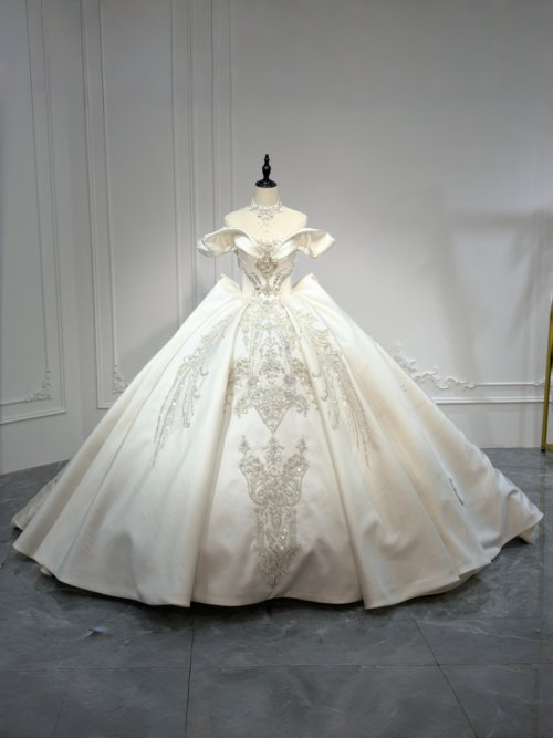 • Luxury Ivory Wedding Dress Off Shoulder Beaded Satin Wedding Gown Cathedral Train Elegant Bridal Ball Gown